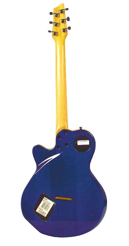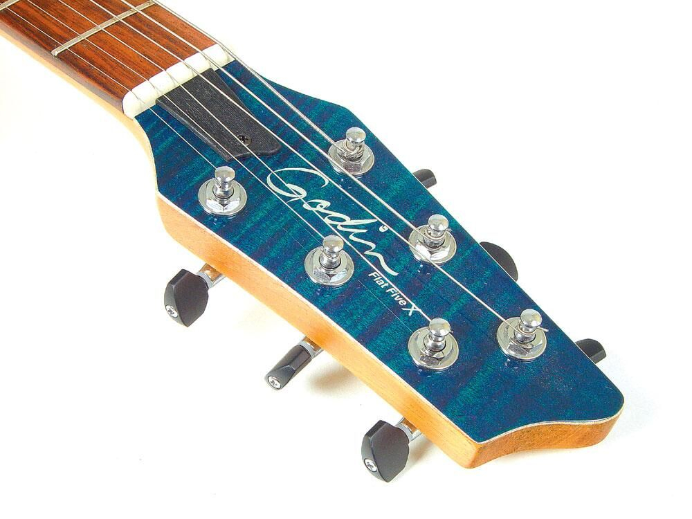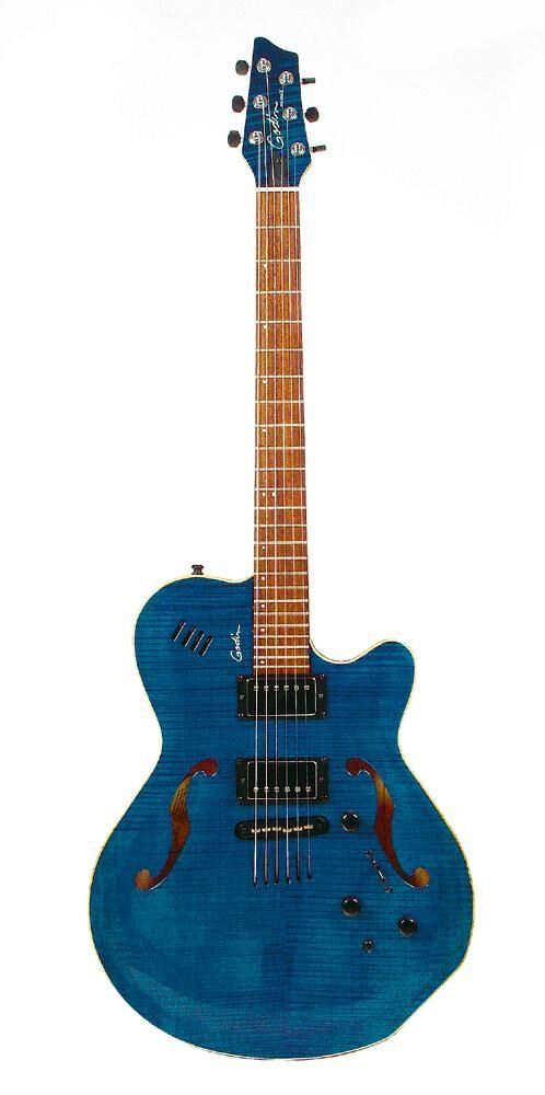 Godin Flat Five X Signature Series Hollow Body, color "Dark Blue", made in Canada in 2003. Features: Solid flamed maple hollow body / solid poplar sides / silver leaf maple center block, Mahogany neck / 24-fret rosewood fingerboard, fixed bridge / through-body stringing, Locking tuners, 2 Godin Custom humbucking pickups + piezo sensors installed in each saddle, 3-band equalization + volume for the piezo, 1 magnetic volume + 1 magnetic/piezo blend + 1 tone, 3-way selector switch, 1 switch to choose between: piezo signal / piezo + magnetic signal / magnetic signal, 2 outputs: magnetic jack and combined acoustic/magnetic, Black hardware, Trans. Blue color, Comes with Deluxe case. The guitar is brand new. €2,800. Price includes original Deluxe case, set of strings, new Hercules stand, new strap, new cable.