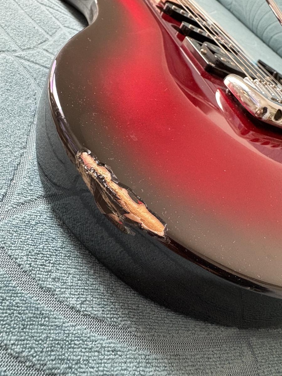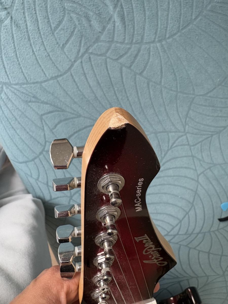 Guitarra nueva, solamente ha sido utilizada como decoración en la pared, pero un día se cayó y tiene una abolladura en la esquina superior.