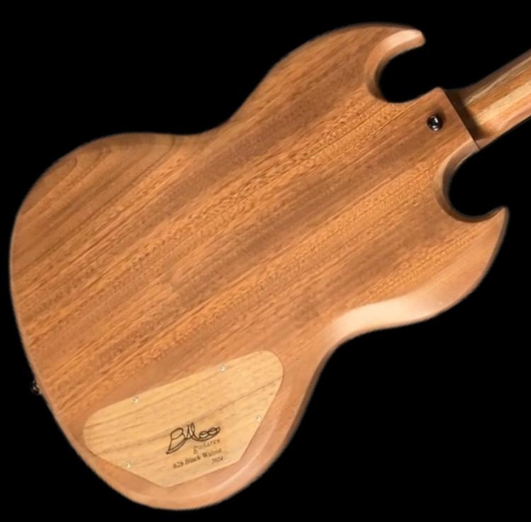 Cuerpo de 35mm, forma tipo Gibson SG, de caoba, con tapa de nogal, micrófonos de Custom Shop