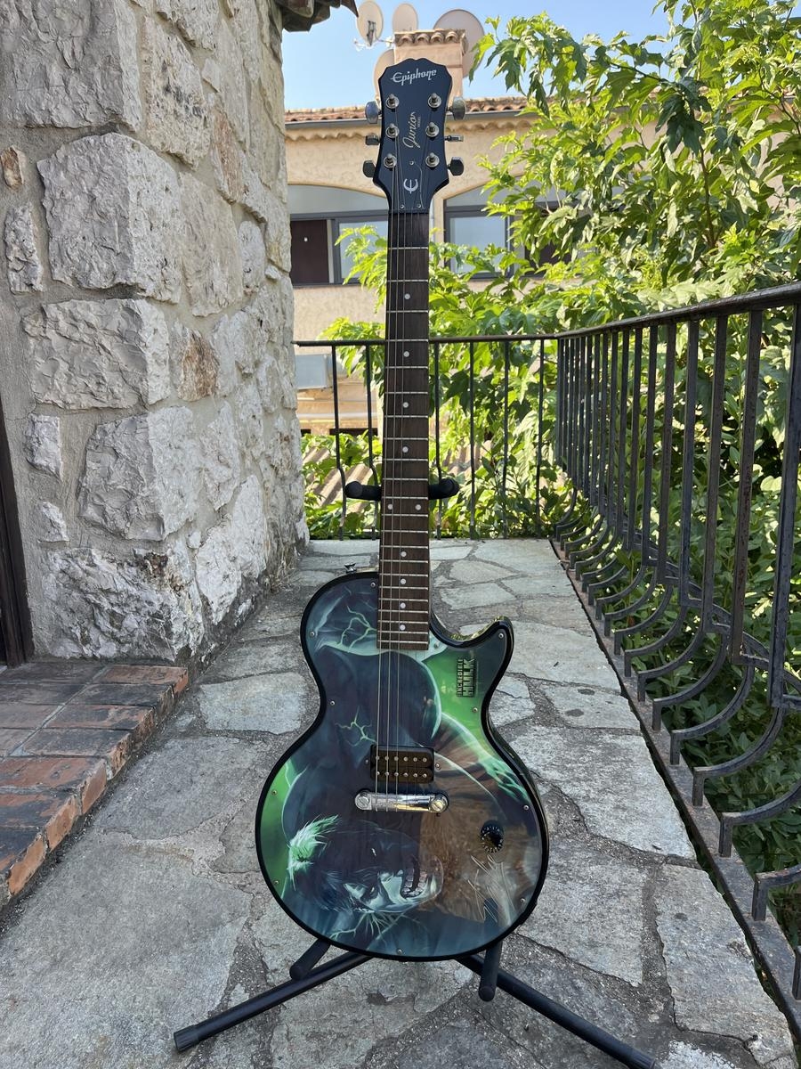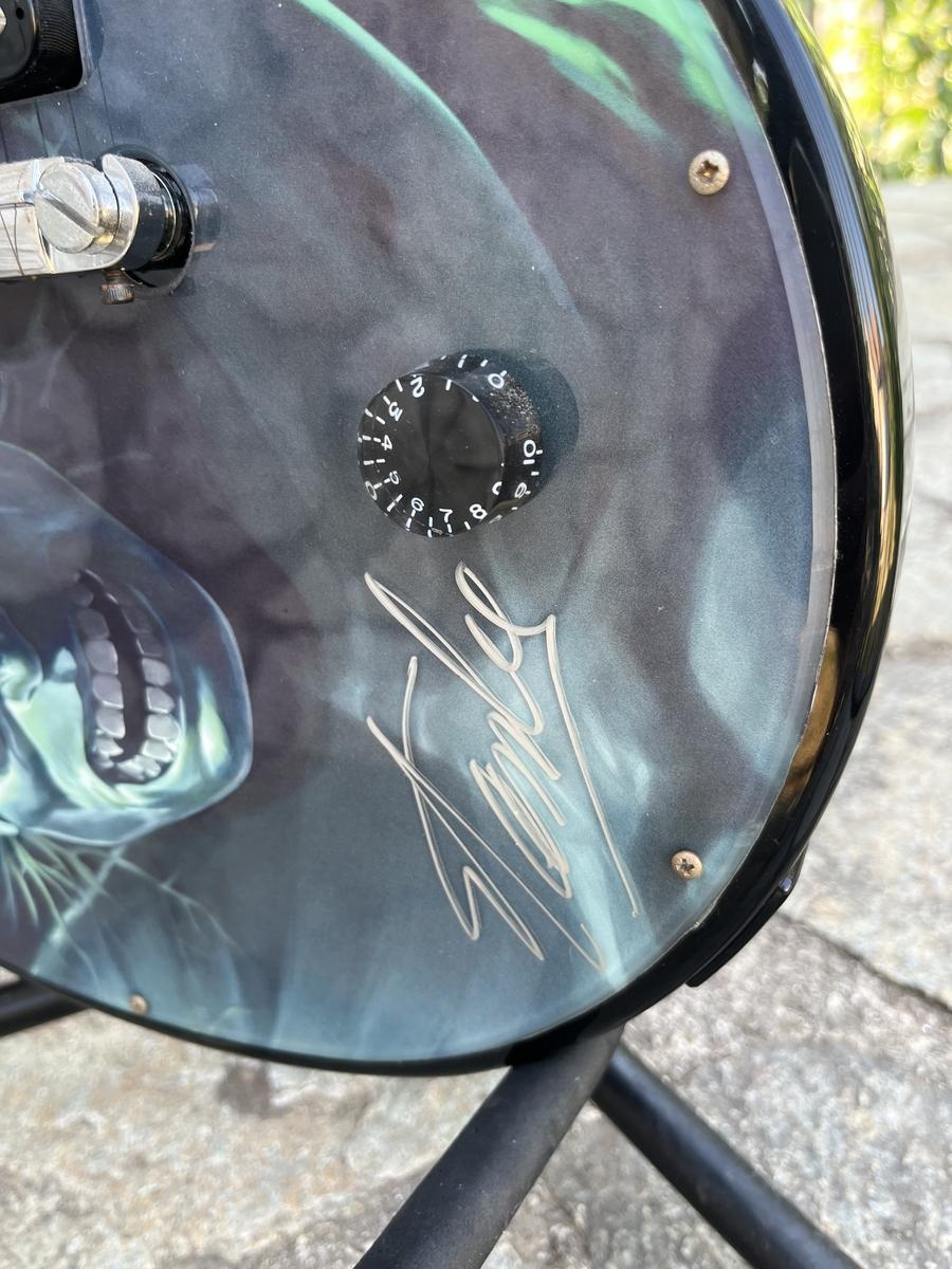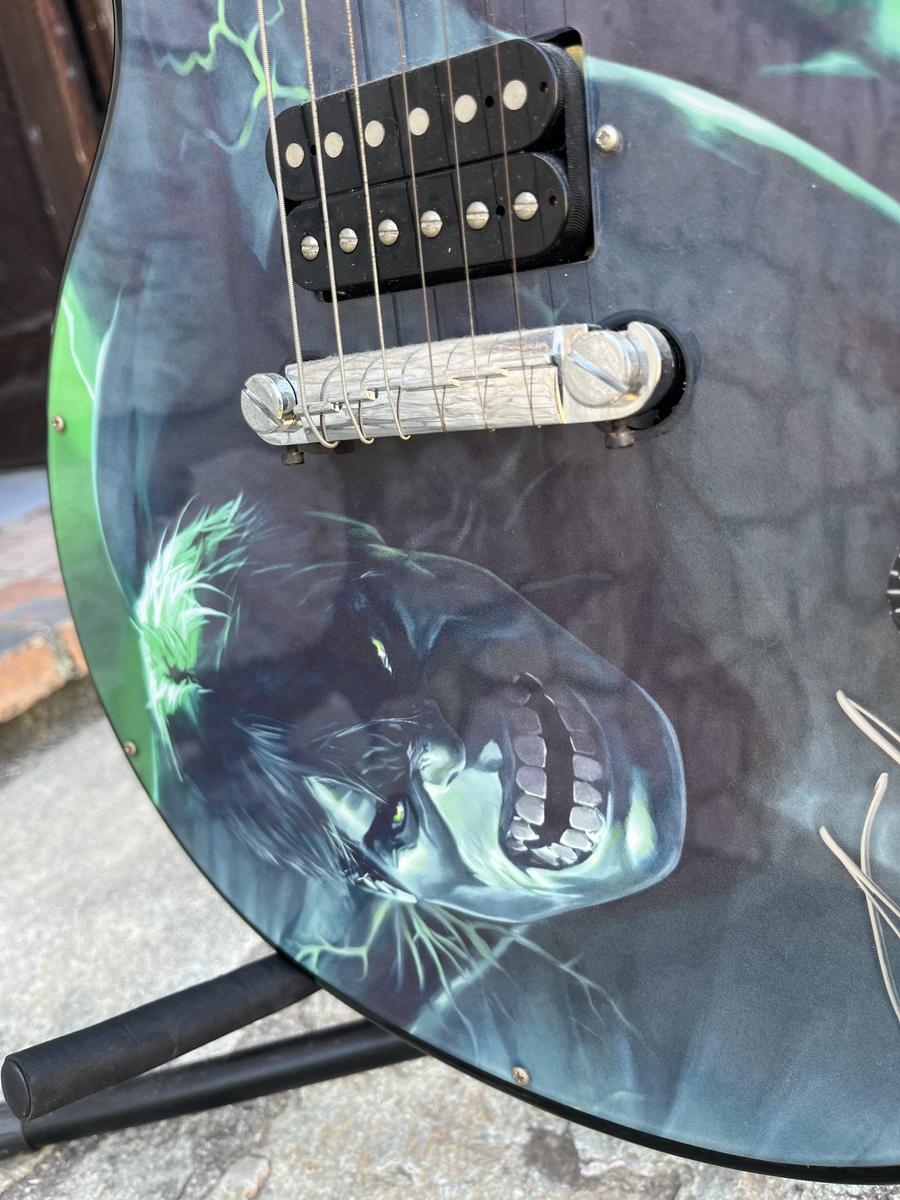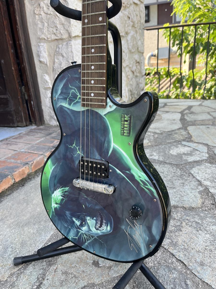 Esta guitarra sólida es una edición limitada del 2007, famosa por su diseño único y su excepcional coleccionabilidad. Gracias a su construcción robusta y diseño refinado con una placa de protección transparente que preserva un dibujo especial, ofrece un aspecto y sonido distintivos. Firmada por Stan Lee, esta guitarra se destaca no solo como un instrumento musical, sino también como una pieza de colección invaluable.