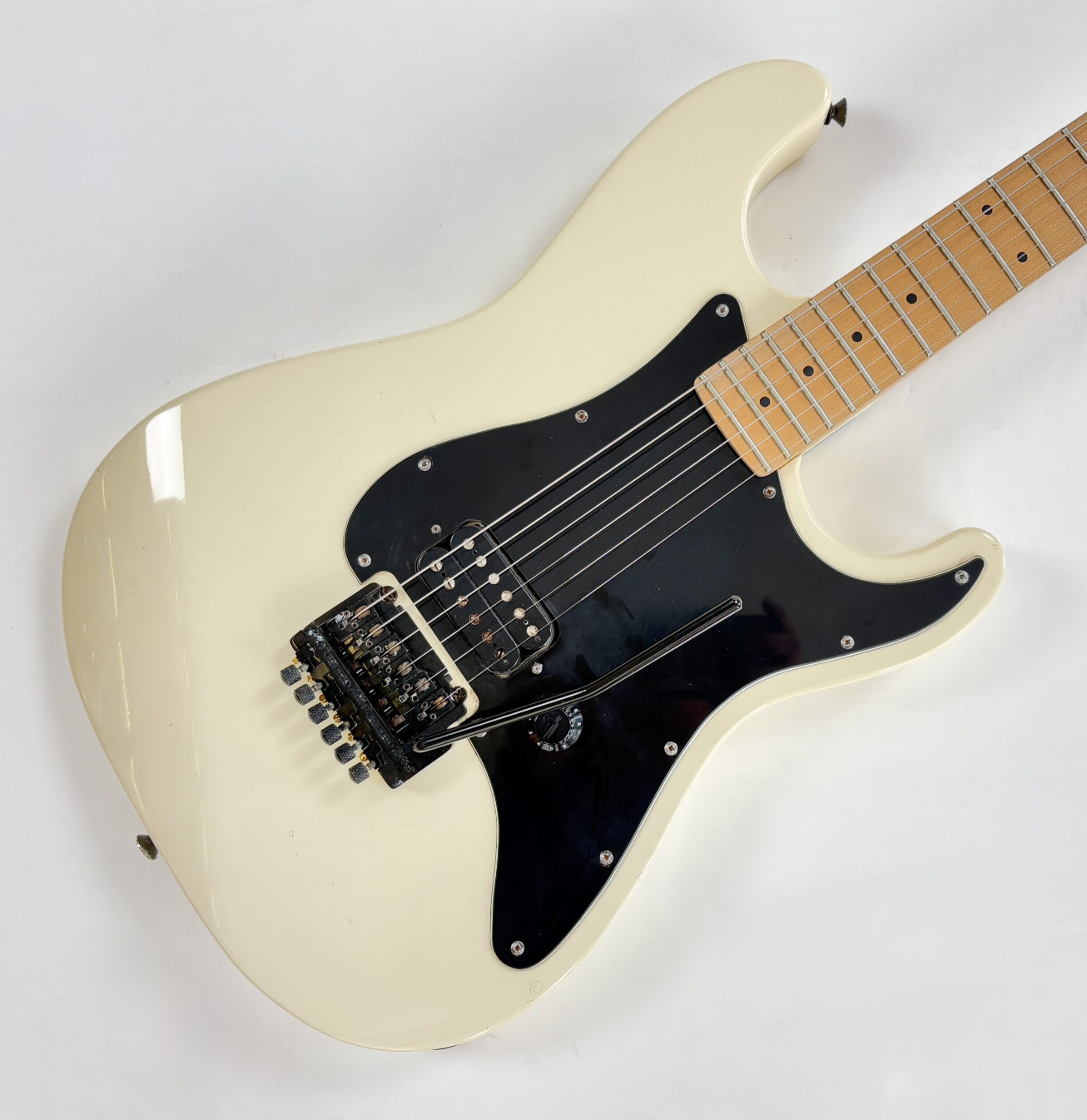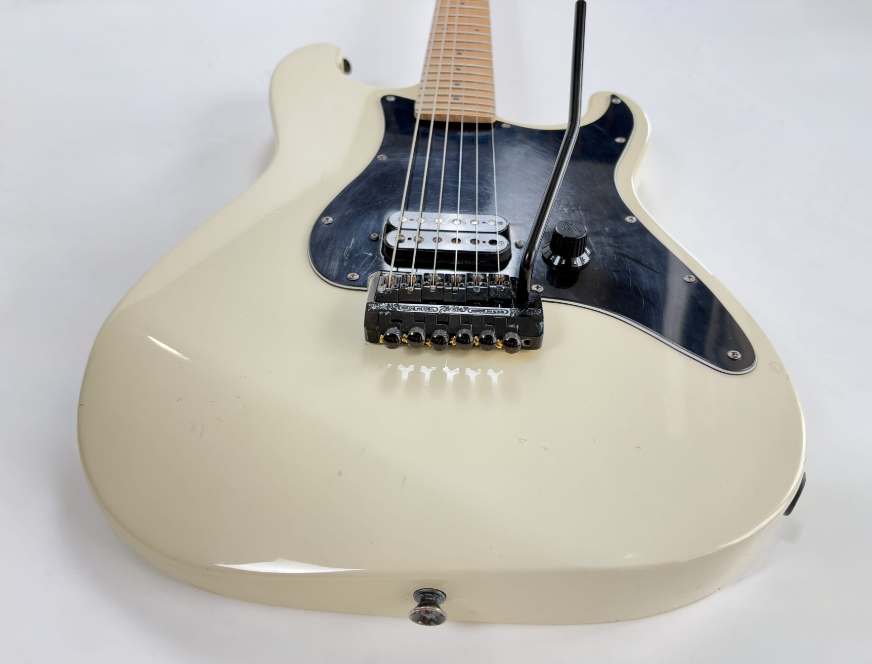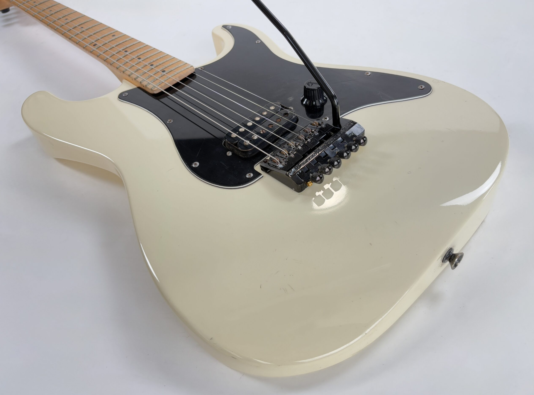 Con su tremolo Kahler, la Stratocaster dio un salto a la modernidad durante los años 80. El tremolo, con su sistema de bloqueo de cuerdas, permite realizar impresionantes "dive bombs". La construcción sigue siendo clásica, con un mástil de arce y diapasón de arce, aunque presenta un radio de 10 pulgadas. Este modelo Boxer es extremadamente sencillo: cuenta con una pastilla humbucker y un solo control de volumen. También es destacable la ausencia de abrazaderas de bloqueo en el clavijero. Como de costumbre, exhibe la excelente artesanía y el montaje impecable típicos de la producción japonesa. Más imágenes y detalles disponibles bajo solicitud. Envío disponible a nivel mundial.