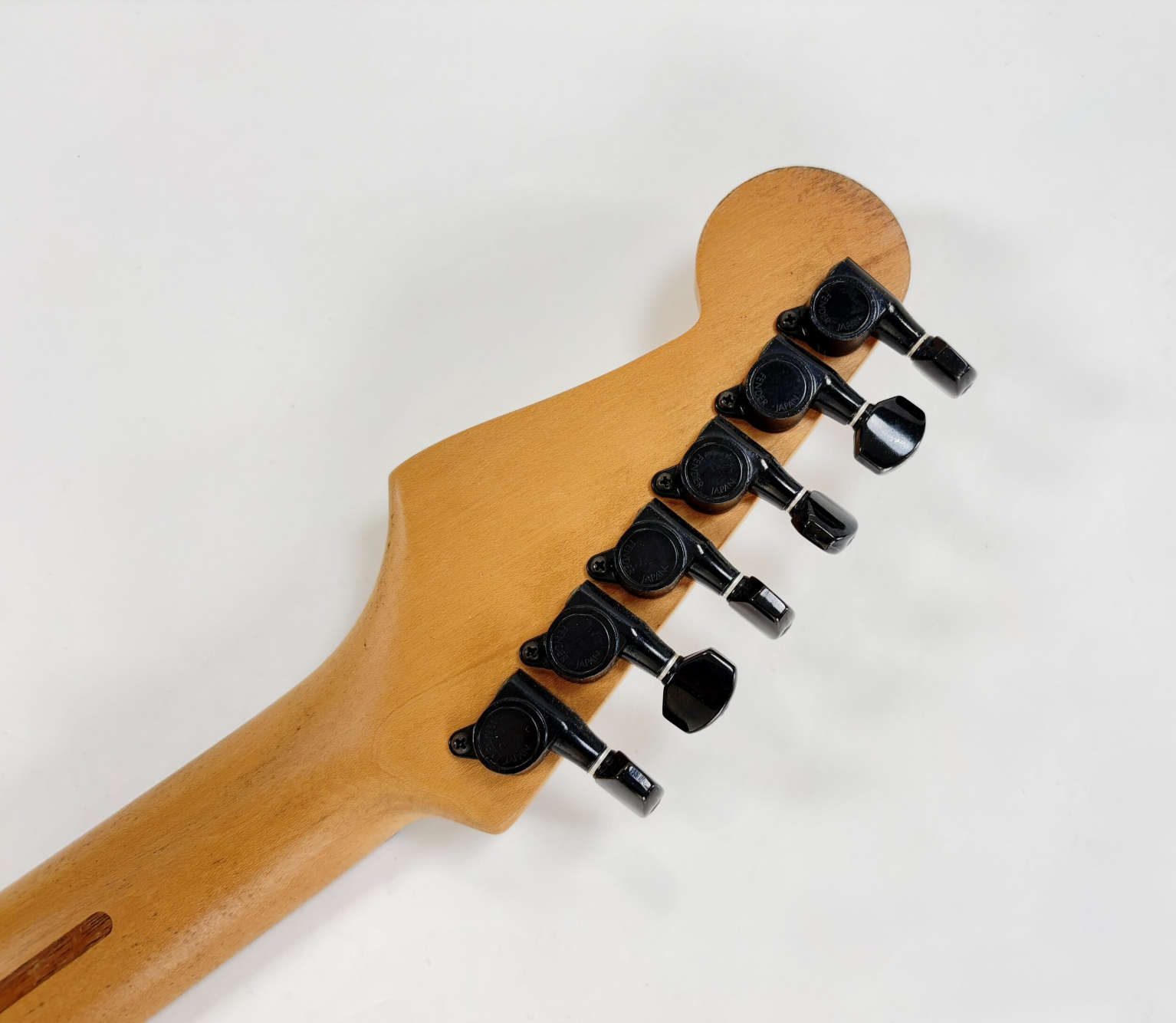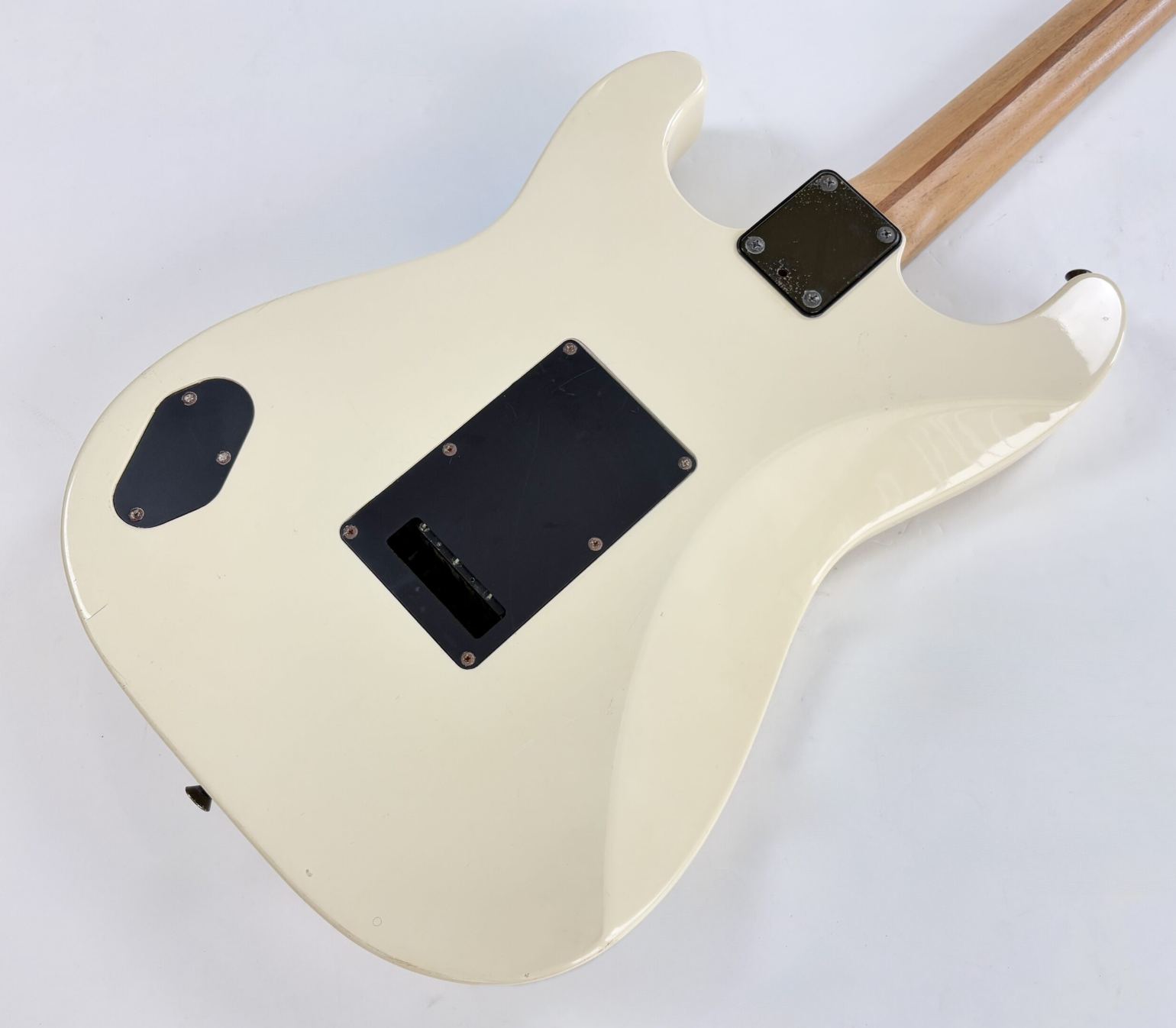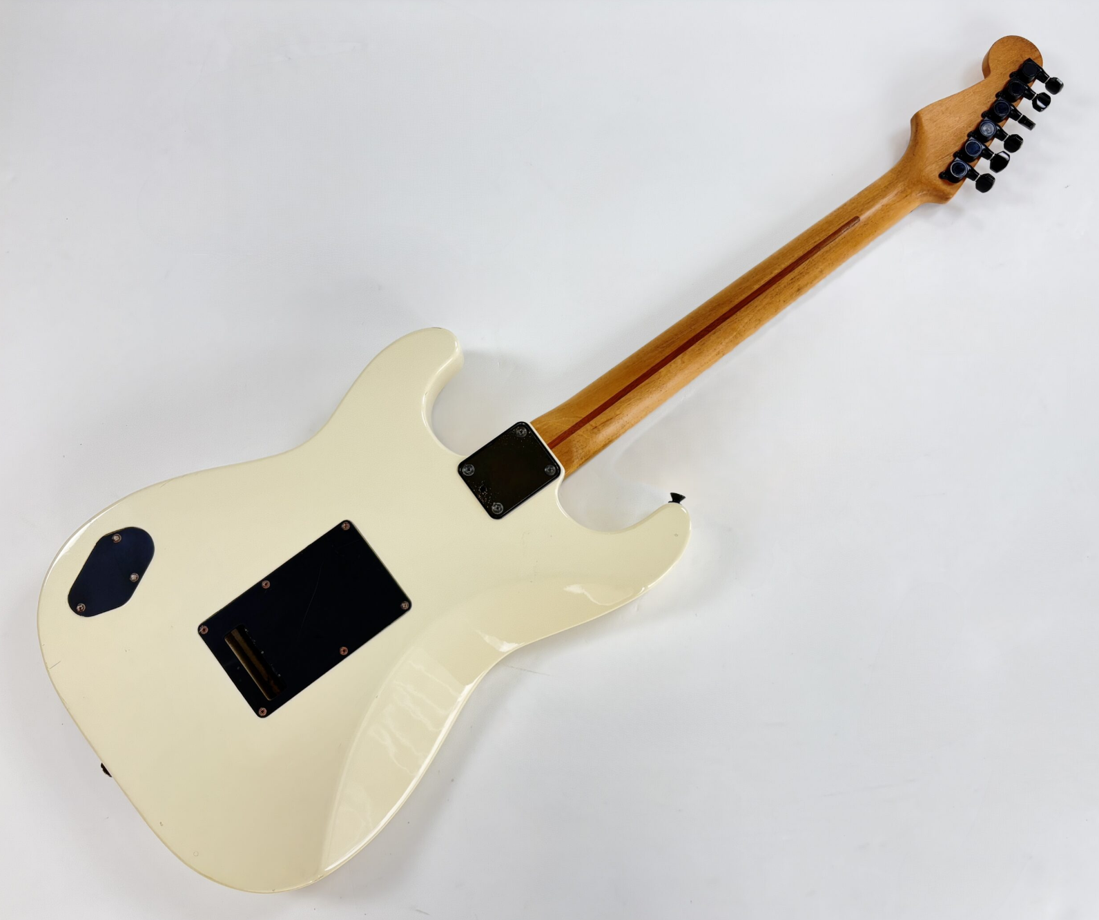 Con su tremolo Kahler, la Stratocaster dio un salto a la modernidad durante los años 80. El tremolo, con su sistema de bloqueo de cuerdas, permite realizar impresionantes "dive bombs". La construcción sigue siendo clásica, con un mástil de arce y diapasón de arce, aunque presenta un radio de 10 pulgadas. Este modelo Boxer es extremadamente sencillo: cuenta con una pastilla humbucker y un solo control de volumen. También es destacable la ausencia de abrazaderas de bloqueo en el clavijero. Como de costumbre, exhibe la excelente artesanía y el montaje impecable típicos de la producción japonesa. Más imágenes y detalles disponibles bajo solicitud. Envío disponible a nivel mundial.
