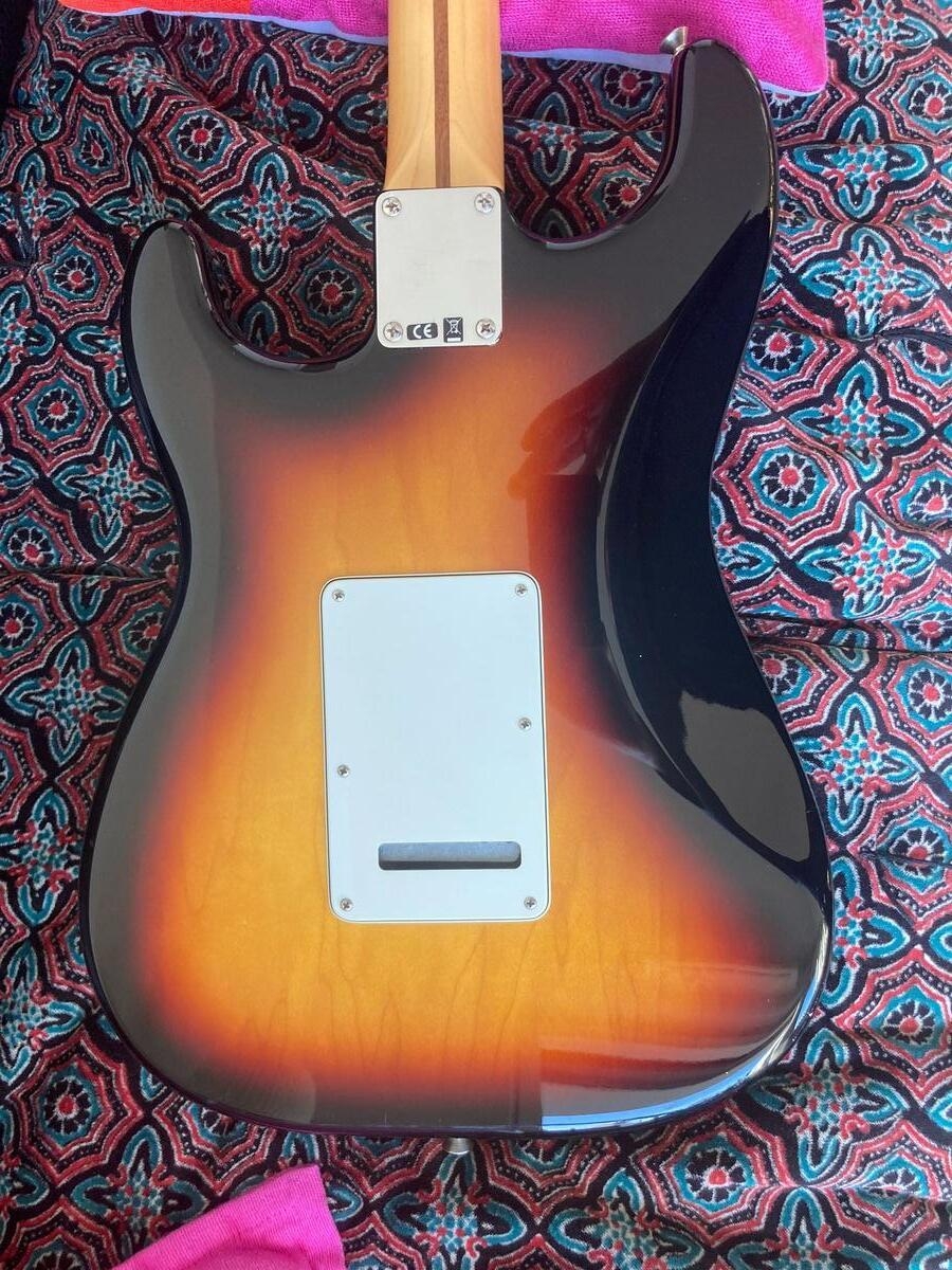 Vendo mi Fender Stratocaster standard de 2012, ligera (3,4 kg), con una resonancia impresionante al aire, y muy cómoda de tocar, el mástil encaja perfectamente en la mano.