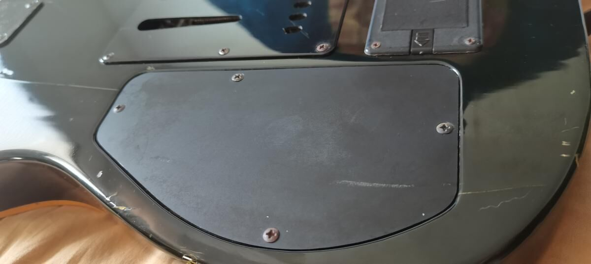 Herrajes chapados en negro, ligeramente desgastados por el tiempo. Es una guitarra japonesa vintage.