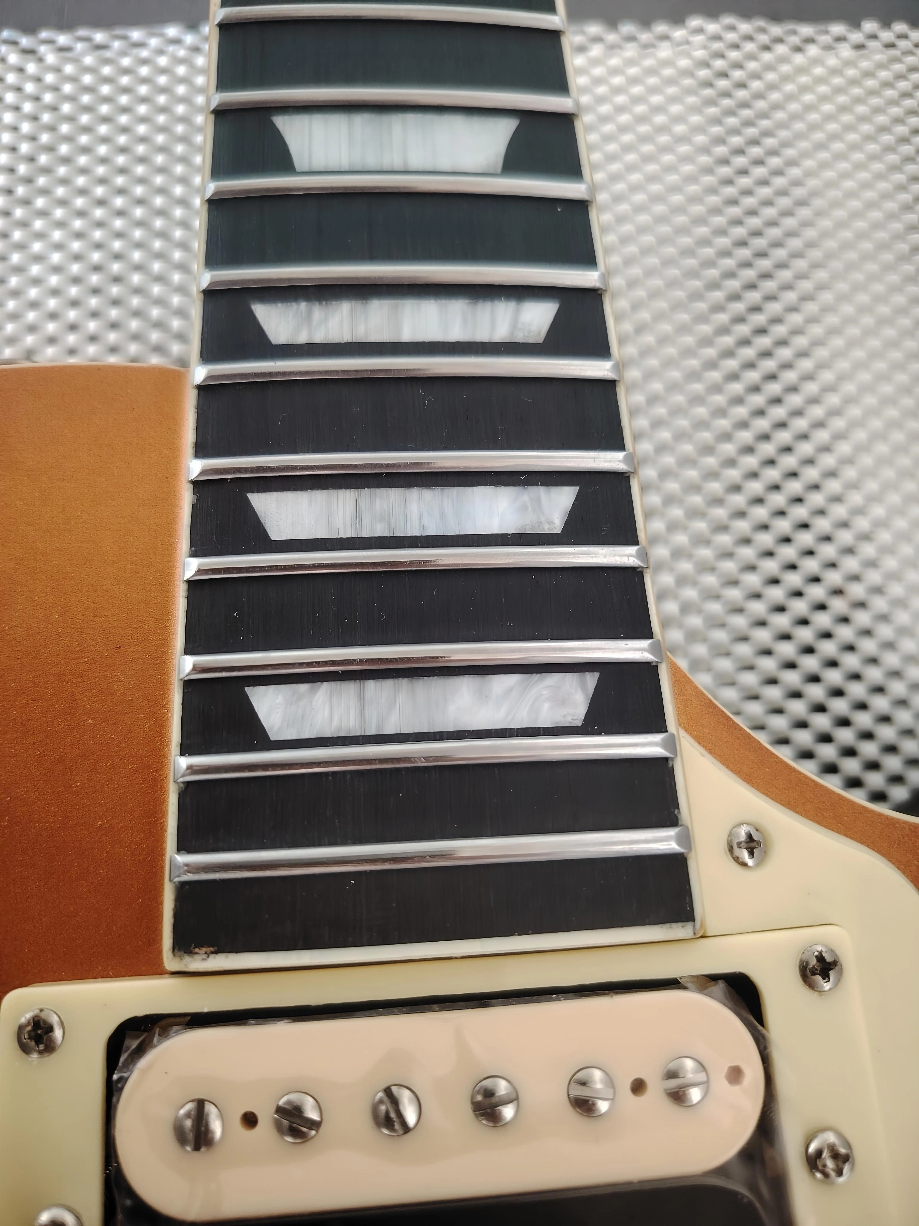 Espléndida guitarra eléctrica estilo Les Paul Harley Benton "Gold Top" (color dorado anaranjado). Totalmente reacondicionada: - Cejuela de hueso - Planeación completa - Pulido de trastes, ajuste del mástil, acción e entonación. - Cuerdas nuevas Ernie Ball 12-56 - Electrónica renovada: cavidades blindadas, 4 potenciómetros de 500k lineales progresivos, condensadores Sprague Orange Drop 22µF, selector nuevo, micrófonos nuevos (sin nombre). Un pequeño rasguño discreto en la parte trasera, invisible al tocar, nada que afecte la comodidad ni el sonido. No se necesita ninguna intervención, ¡guitarra ajustada y lista para tocar! ¡Conéctala y toca! Ideal para el blues, rock... Se vende con una funda gruesa y acolchada. Entrega en persona.