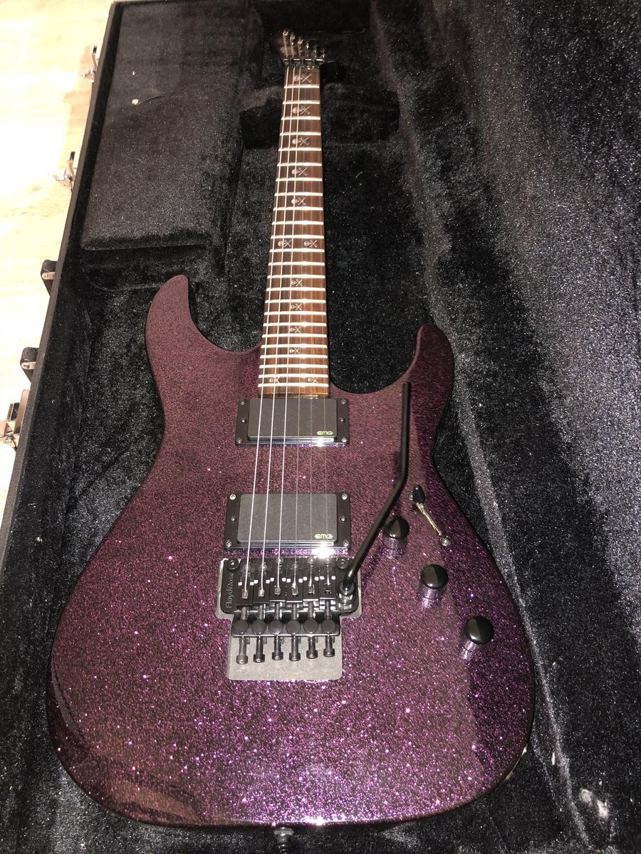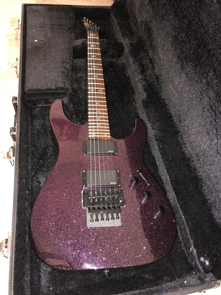 Guitarra de cuerpo sólido, electrónica activa, cuerpo de aliso, mástil de arce con perfil extra fino en forma de U, diapasón de Pau Ferro, 24 trastes jumbo, pastillas activas de doble bobina EMG Kirk Hammet Bone Breaker, clavijero LTD con baño de aceite, puente flotante de doble bloqueo Floyd Rose 1000, interruptor de 3 posiciones (2 controles de volumen/1 control de tono), acabado con purpurina.