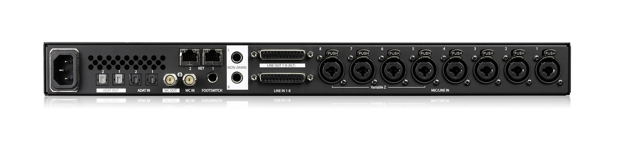 • 8 entradas de micro/línea balanceadas XLR/TRS con Impedancia Variable en las entradas 5-8, controlables de forma remota desde Pro Tools