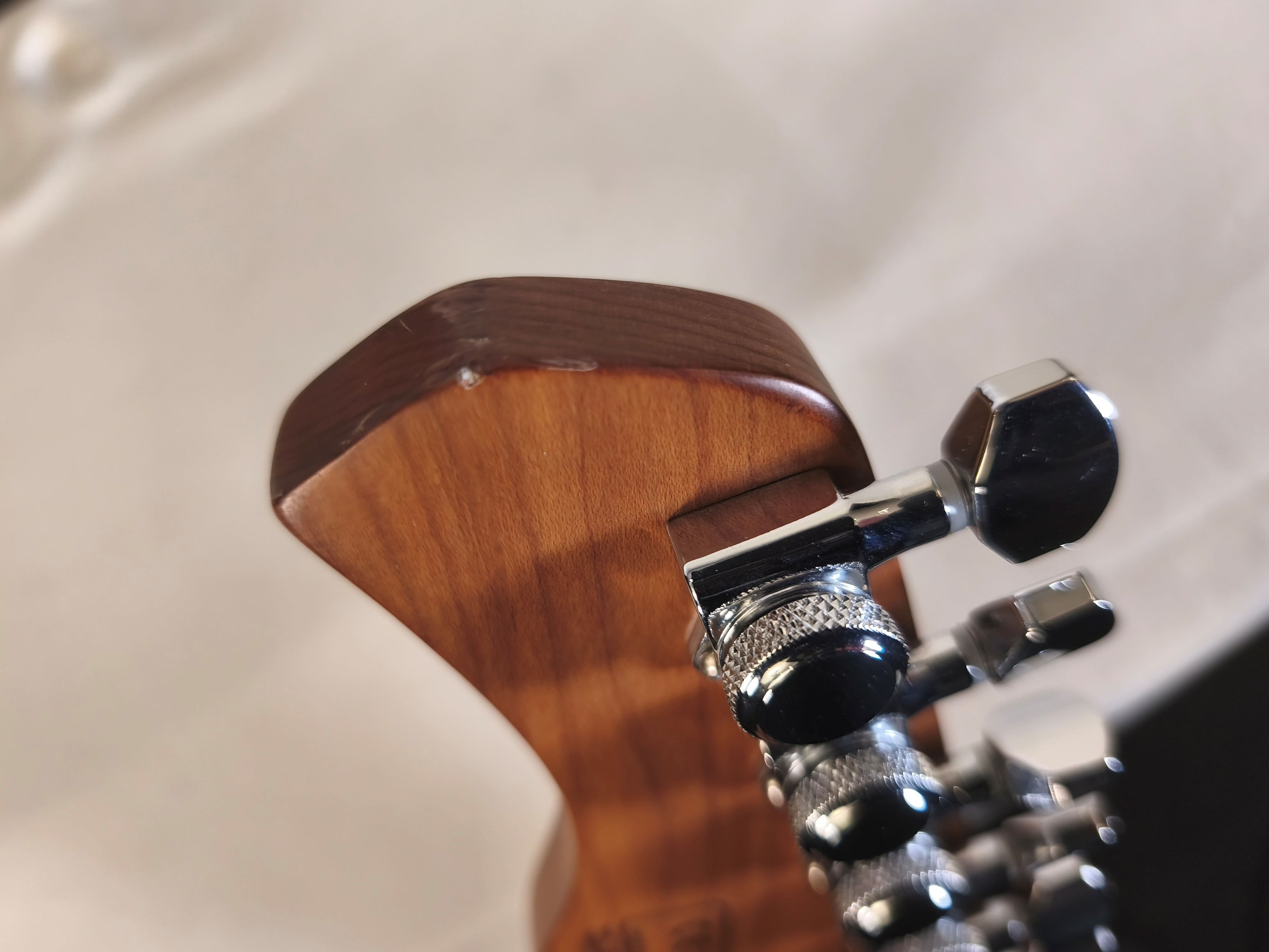 Su tremolo S7 de 2 puntos, con bloque de acero inoxidable, permite ajustar el tono con facilidad, mientras que las clavijas premium autoblocantes cromadas garantizan una afinación excepcional. A pesar de una pequeña astilla en la pala, esta guitarra sigue siendo perfectamente funcional y estética.