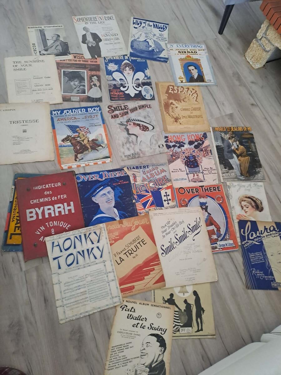 Me han dado alrededor de veinte partituras antiguas de piano bar. No soy un especialista en música. No tengo ni idea de cuánto puede valer este lote. El estado de los documentos es medio e incluso algo deteriorado (manchas, dobleces), pero aparentemente están íntegros. Algunas partituras me parecen antiguas. Es posible que haya algunos documentos raros en el lote. El precio de venta es un punto de partida para negociar al alza o a la baja. Estoy a su disposición para enviarle personalmente más información o fotos.