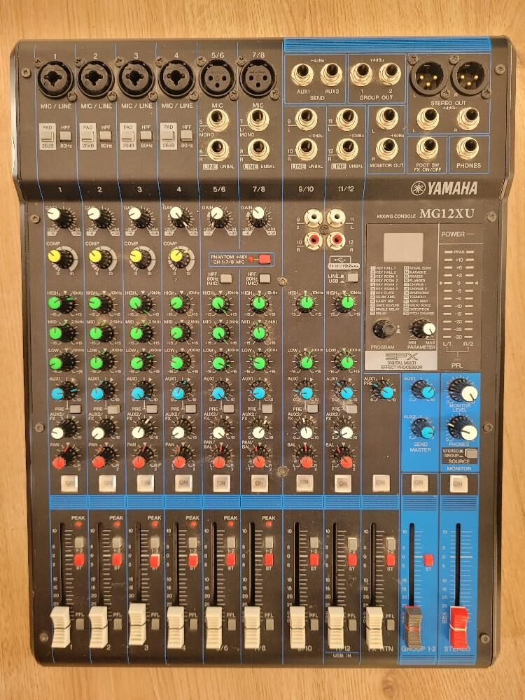 Vendo esta mesa de mezclas Yamaha MG12XU, ideal para DJs y estudios caseros. - Tipo de producto: mesa de mezclas - Marca: Yamaha - Modelo: MG12XU - Número de canales: 12 - Conectividad: Entradas XLR y Jack, Salidas estéreo y mono - Funcionalidades: Ecualizador de 3 bandas por canal, Efectos integrados. Buen estado.