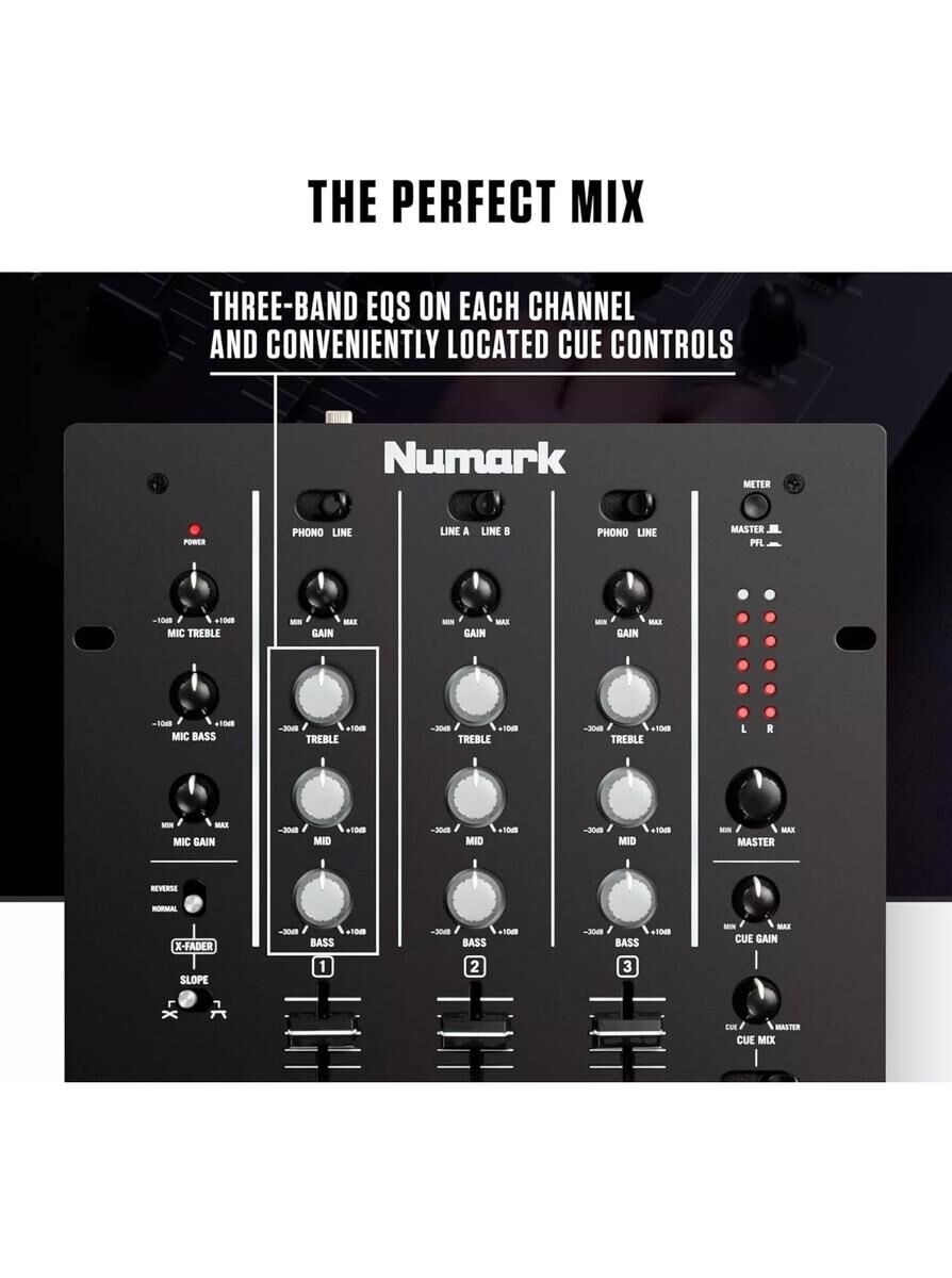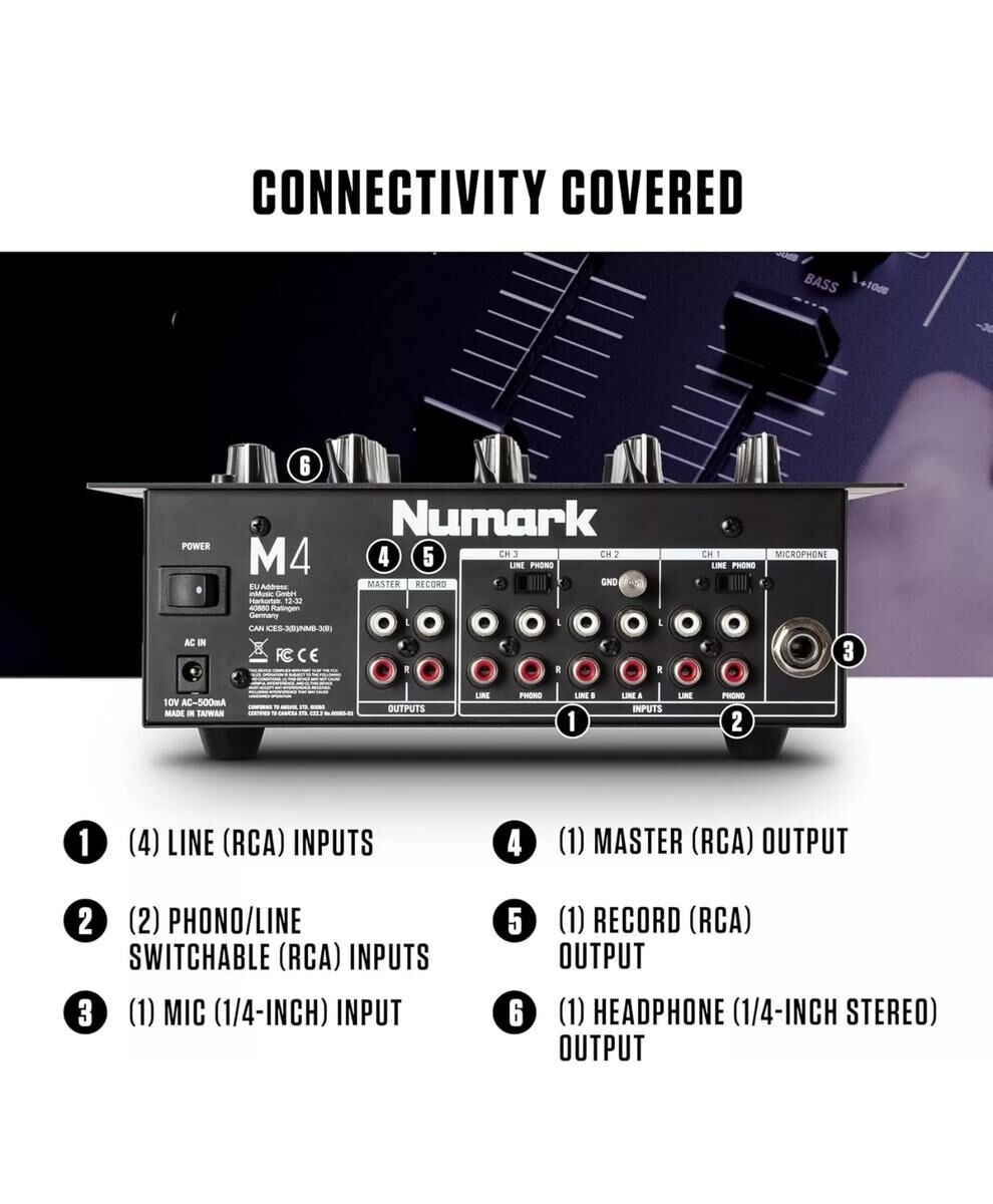 La Numark M4 es una mesa de mezclas DJ de 3 canales compacta, confiable y perfectamente adaptada a las necesidades de DJs principiantes y experimentados. Diseñada para el scratch, las mezclas en vivo o los sets en clubes, incluye un crossfader reemplazable, una ecualización de 3 bandas por canal y múltiples entradas para una compatibilidad máxima con todas las fuentes de audio.