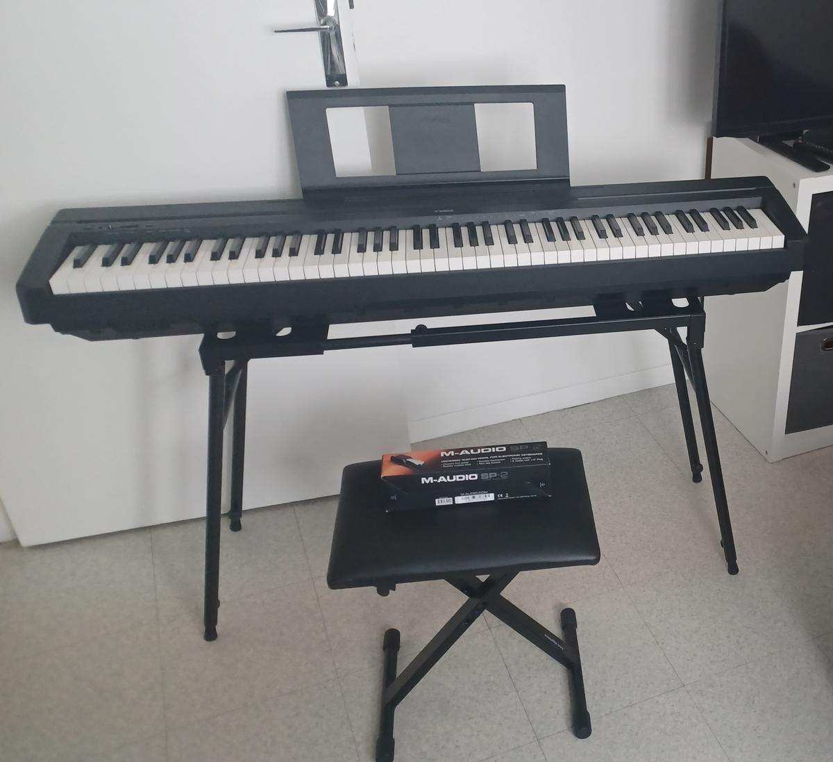 Con silla, piano, pedal, soporte.