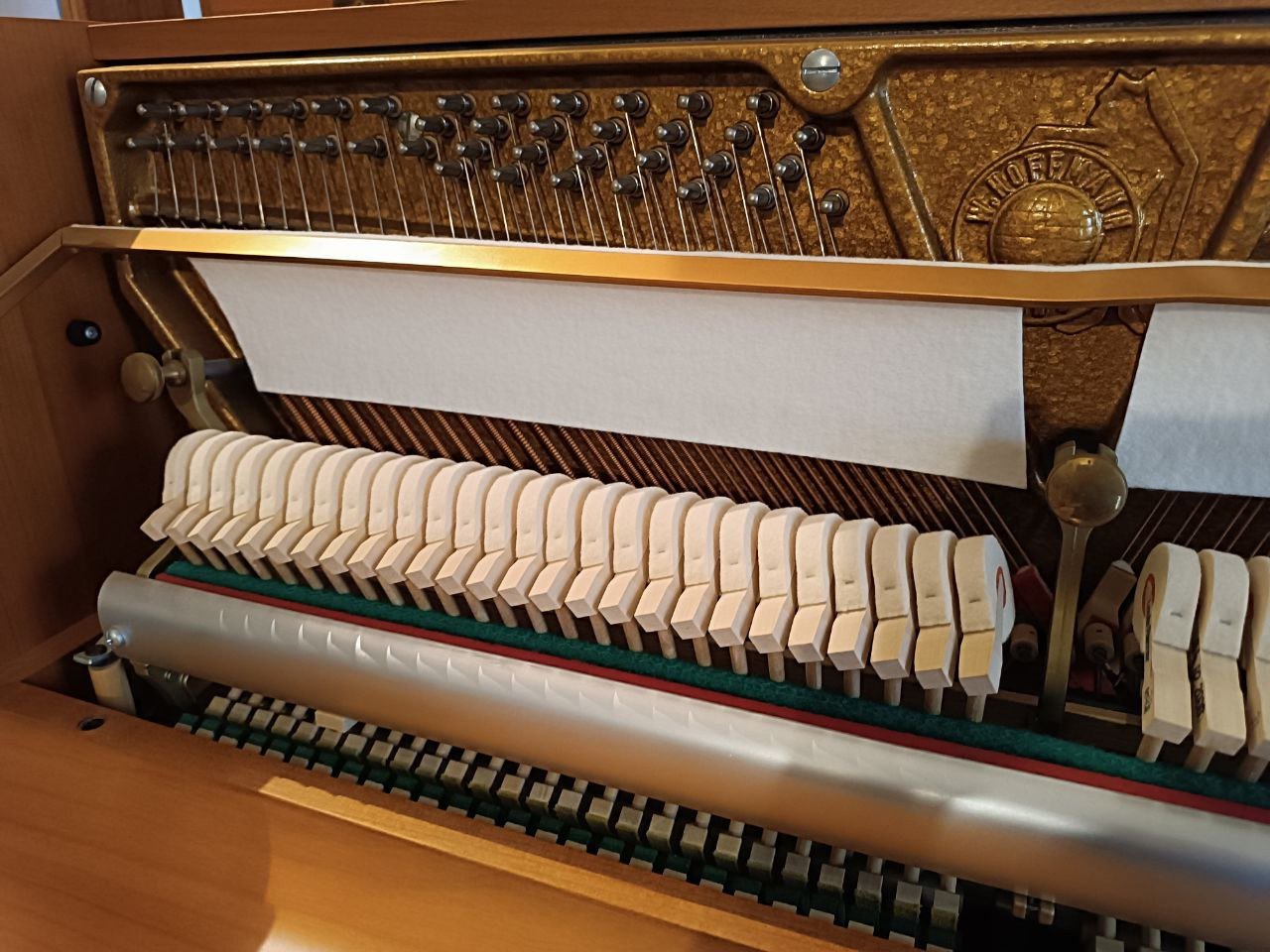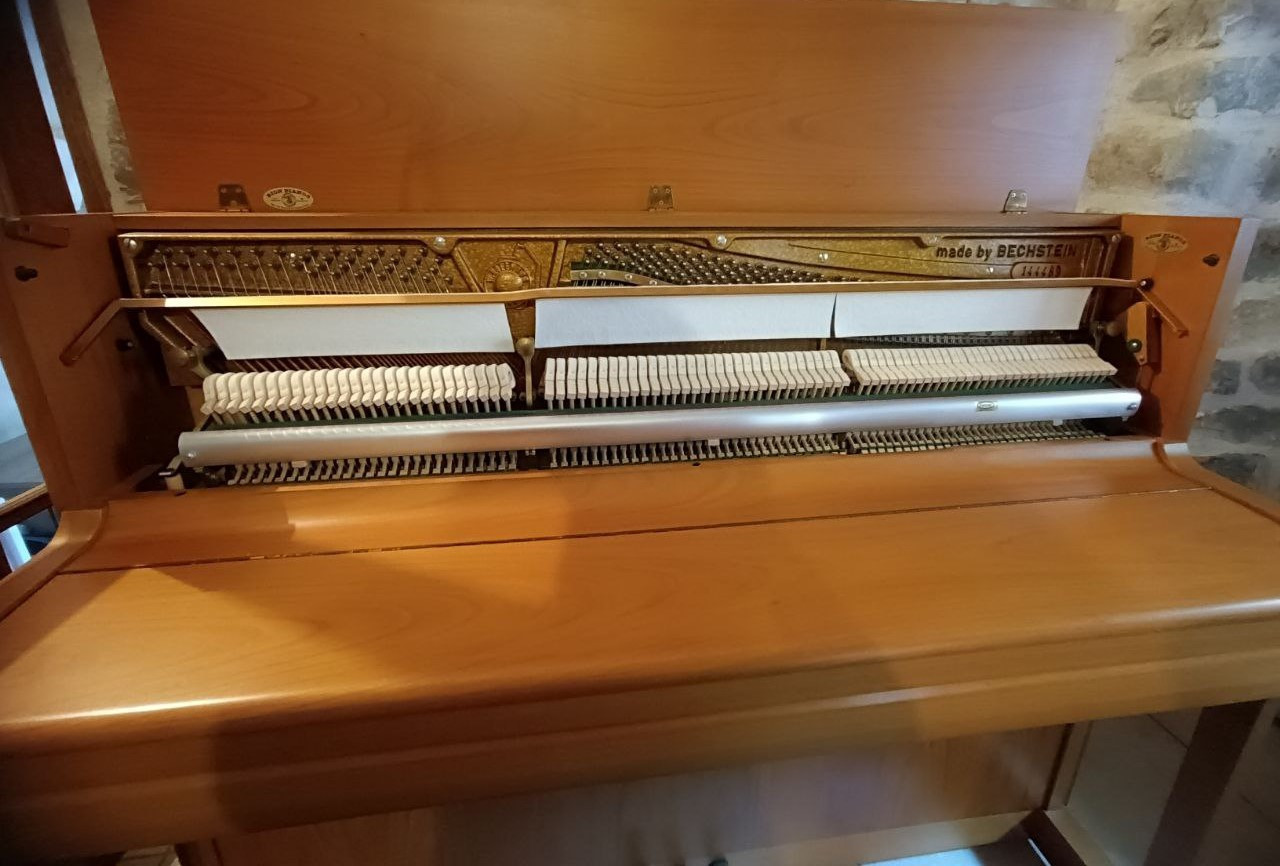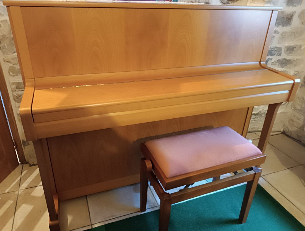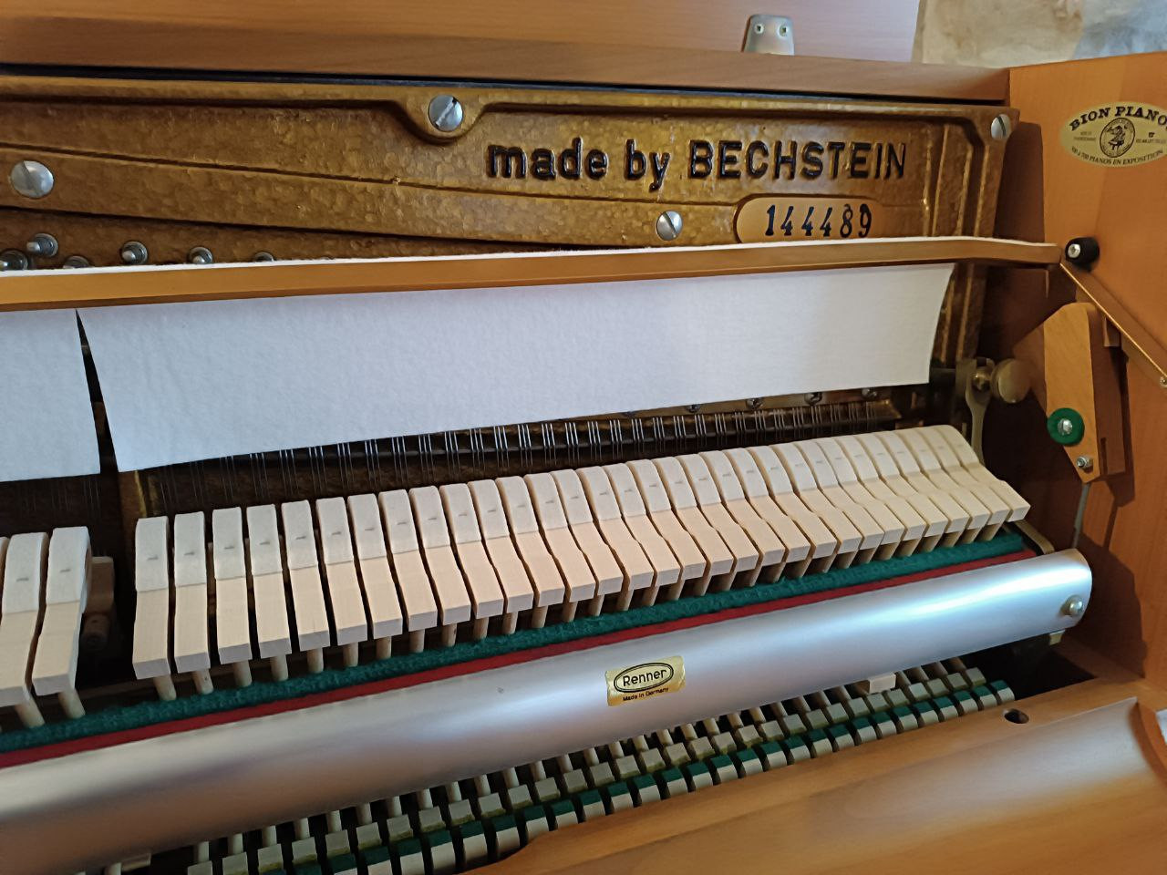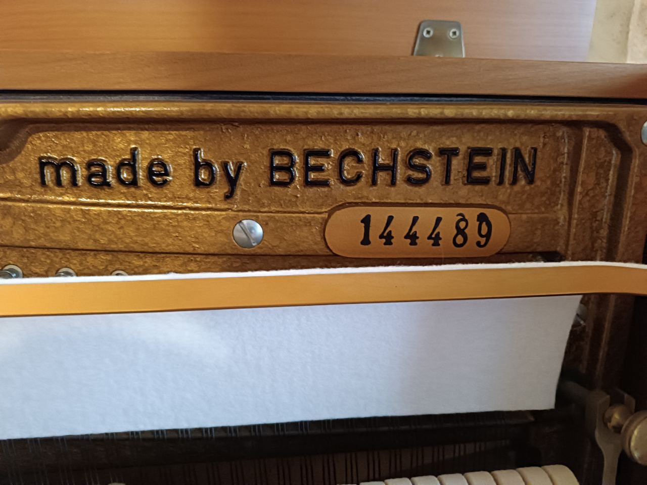 Vendo Piano HOFFMANN Trend 120 en acabado caoba, fabricado "Made by BECHSTEIN" bajo el número 144489\nAño de compra: 12 de noviembre de 2001\nEste piano de primera mano ha sido afinado regularmente.\nLa tabla armónica, el encordado, los martillos de fieltro y el conjunto mecánico de los pedales se encuentran en perfecto estado.