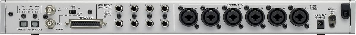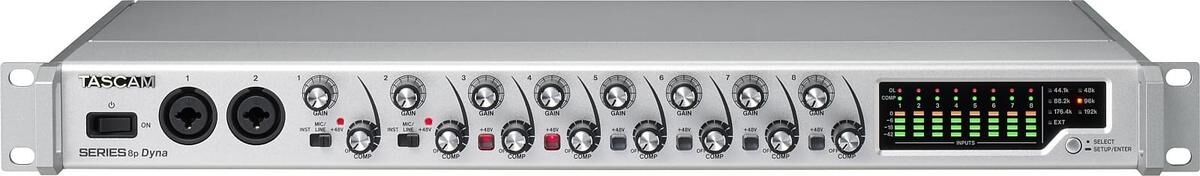 • Previo de micrófono de 8 canales con compresor analógico e interfaz ADATEl Tascam SERIES 8p Dyna es una excelente elección tanto para estudio como para escenario, gracias a sus excelentes características de audio, flexibilidad de conexiones e increíbles preamplificadores de micrófono. Viene en un resistente chasis de 1U para montaje en rack, y sus dos puertos ópticos S/MUX lo convierten en una perfecta expansión para interfaces como el Tascam SERIES 102i o 208i, o cualquier interfaz de audio compatible con S/MUX o ADAT simple. También se puede usar de forma independiente como preamplificador. Además de sus 8 salidas individuales en jack TRS, el preamplificador SERIES 8p Dyna también cuenta con un conector D-Sub 25 multidispositivo balanceado, que facilita la conexión con dispositivos de salida XLR, como el BO-16DX/OUT. Su entrada/salida de wordclock garantiza una perfecta sincronización cuando se utilizan varios preamplificadores en paralelo o se integran con otros dispositivos profesionales. Cada entrada de micrófono permite la activación individual de la alimentación phantom +48 V para micrófonos de condensador, y cuenta con un compresor analógico de un solo botón de fácil uso con True Bypass. Un conjunto completo de indicadores proporciona información sobre los niveles de señal, compresión, posible sobrecarga y frecuencia de muestreo actual.