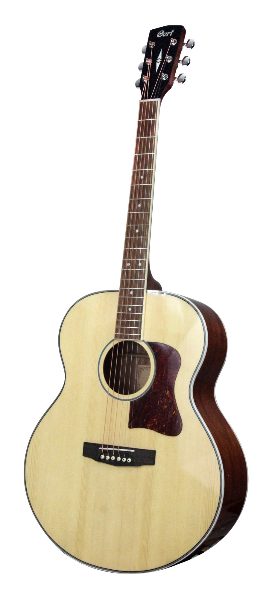 Se trata de un instrumento diseñado para ofrecer una buena proyección y una comodidad de interpretación adecuada para numerosas situaciones musicales. Su forma Jumbo favorece un sonido amplio, mientras que la tapa de abeto, asociada al fondo y a los aros de caoba, contribuye a un resultado equilibrado. El mástil de caoba y el diapasón de merbau aportan un tacto agradable. Su sistema de amplificación Cort CE306T permite un uso amplificado práctico. El acabado natural brillante realza el aspecto sobrio y elegante del instrumento.