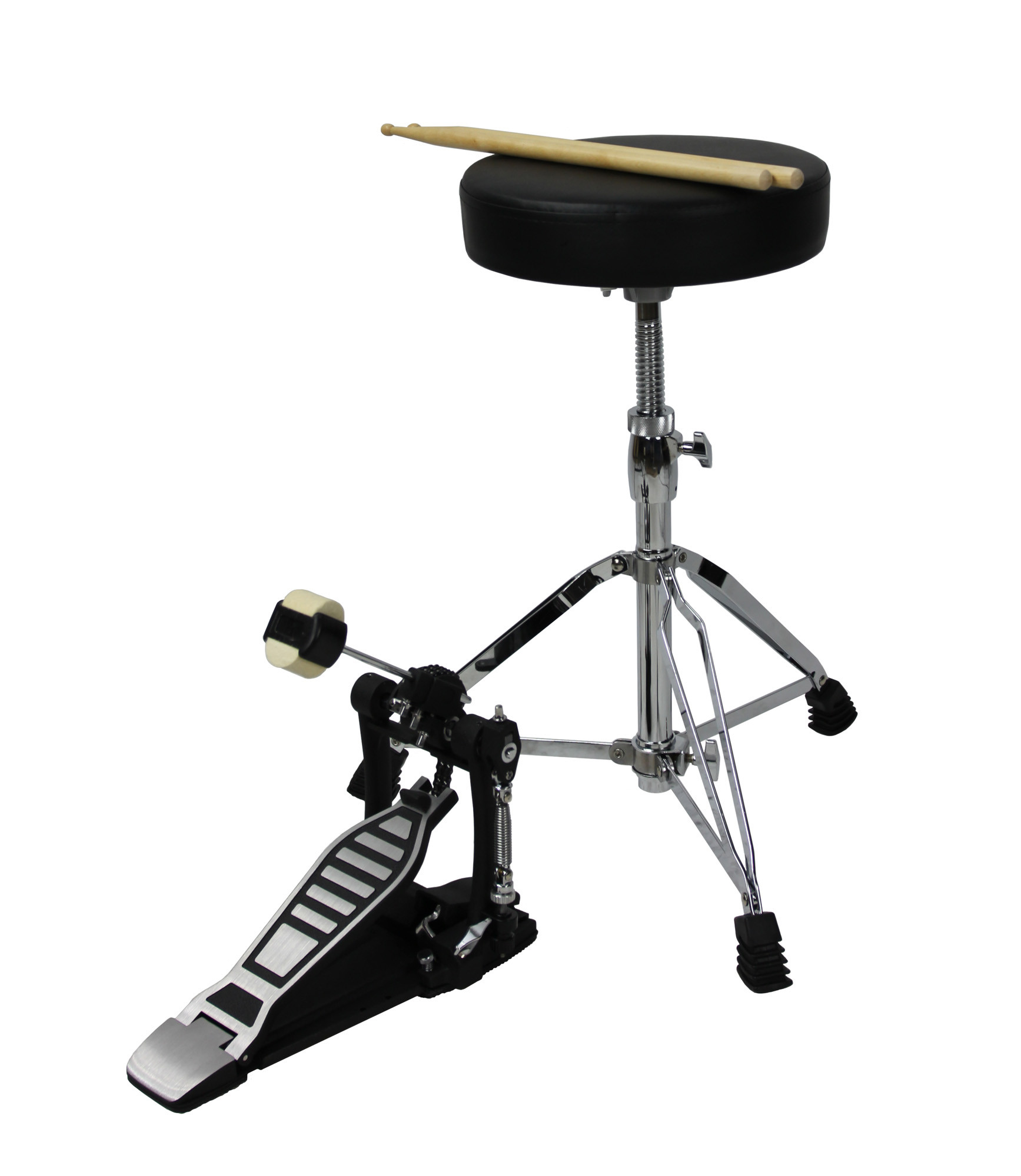 Esta elección es pertinente si desea reunir en una sola compra varios accesorios imprescindibles: un pedal de bombo, un asiento de tornillo y un par de baquetas, sin multiplicar las referencias.