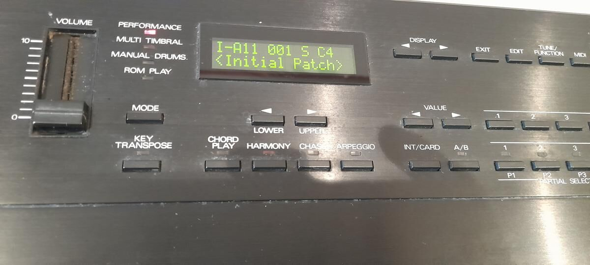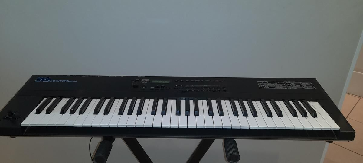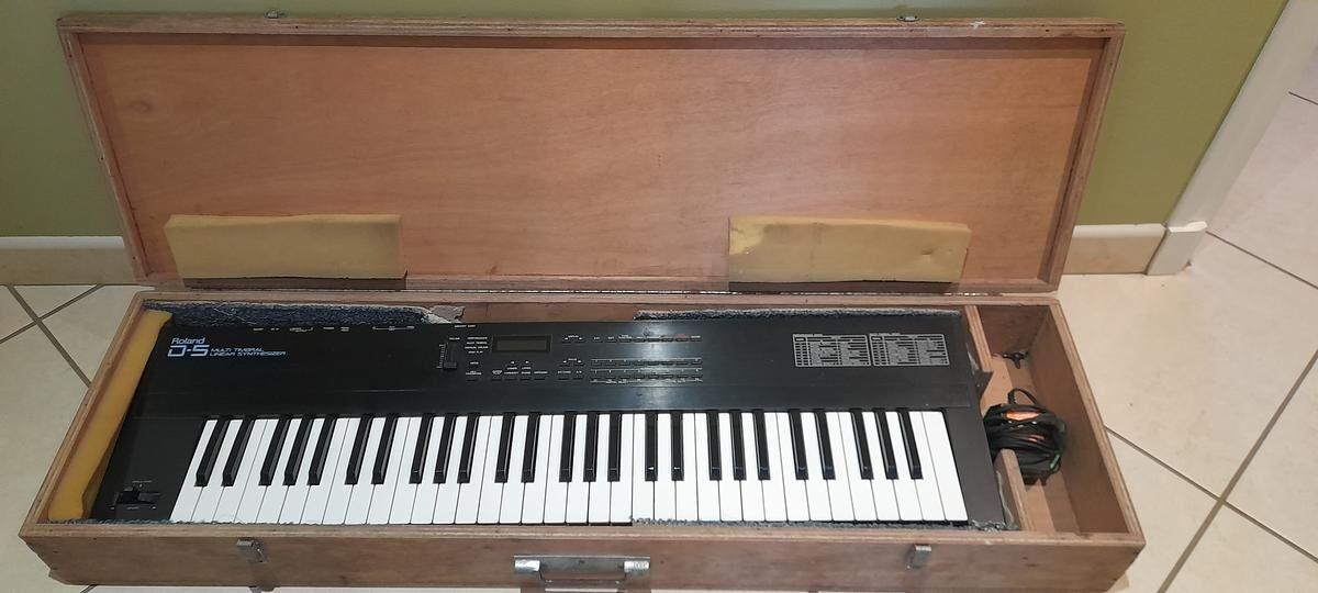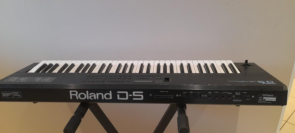 Roland D-5 en perfecto estado de funcionamiento, estéticamente con algunas marcas leves. Con alimentación Roland y estuche de transporte de madera.