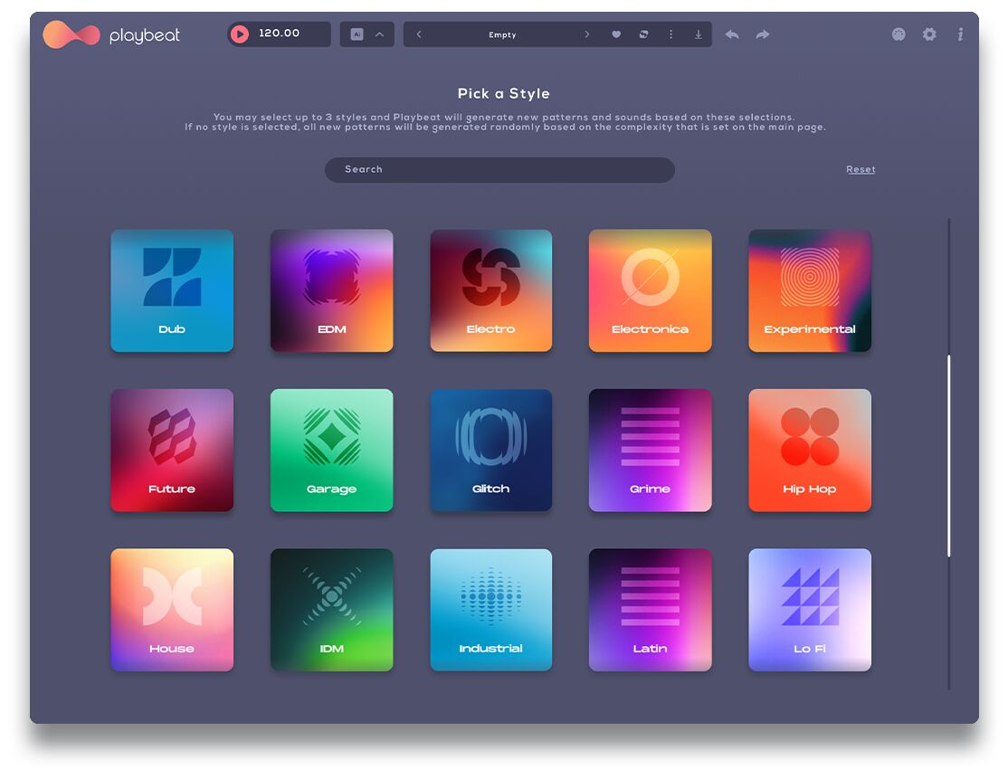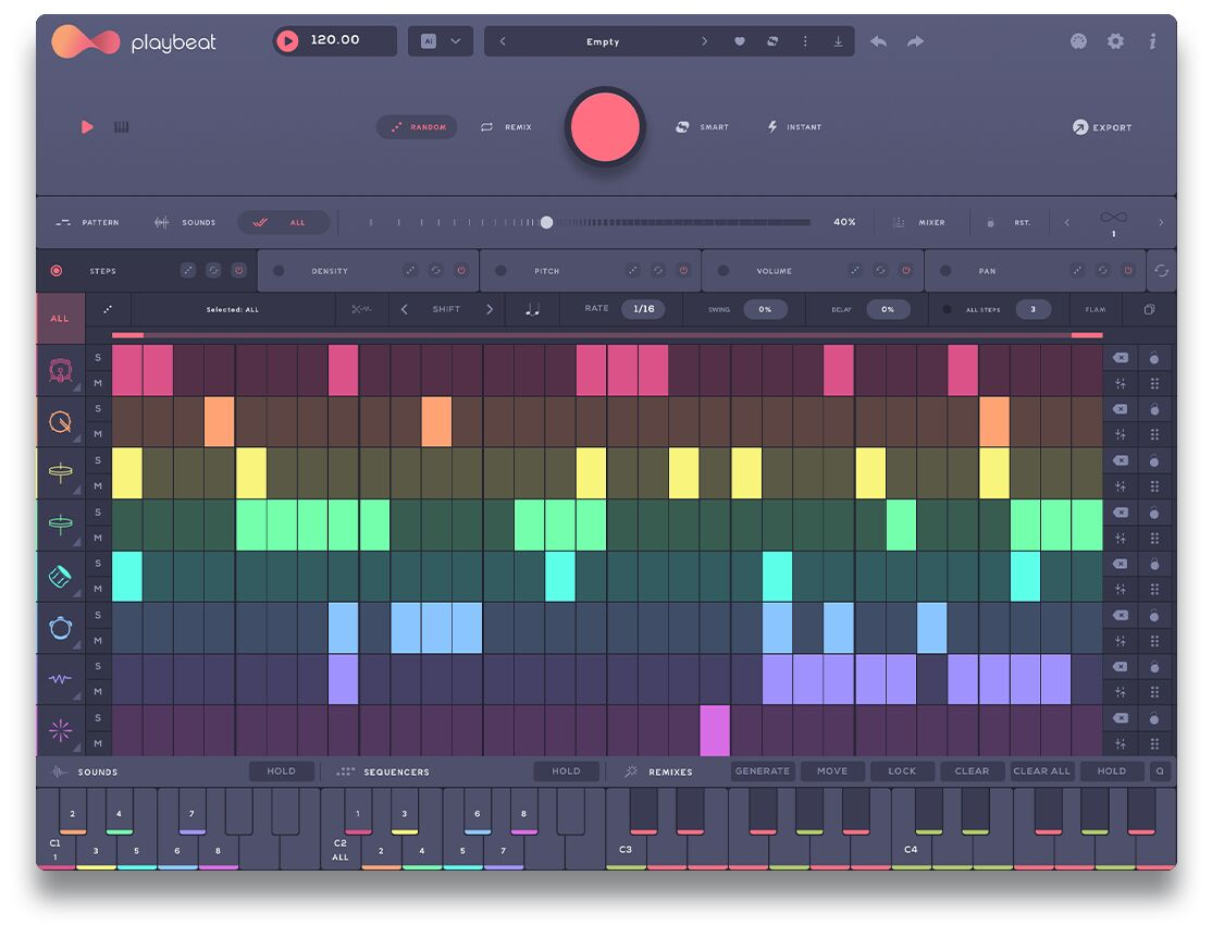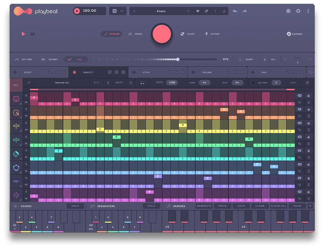 Playbeat 4 cuenta con nuevos algoritmos vanguardistas y revolucionaria generación de patrones basada en géneros, permitiendo crear infinitos patrones, sonidos y ritmos. Ningún ritmo será igual, ofreciendo una experiencia completamente nueva y dinámica cada vez que crees. Garantiza que los patrones generados sean utilizables, musicales y frescos, brindándote una precisión y control inigualables. Ya sea que estés creando patrones de batería, enviando módulos MIDI o generando remezclas infinitas sobre la marcha. La nueva función de aleatorización basada en géneros de Audiomodern te permite seleccionar tus estilos de música preferidos y generar patrones adaptados a esas elecciones. Tienes control total sobre la complejidad del ritmo y puedes especificar si necesitas pistas de batería completas, sonidos individuales o solo patrones.