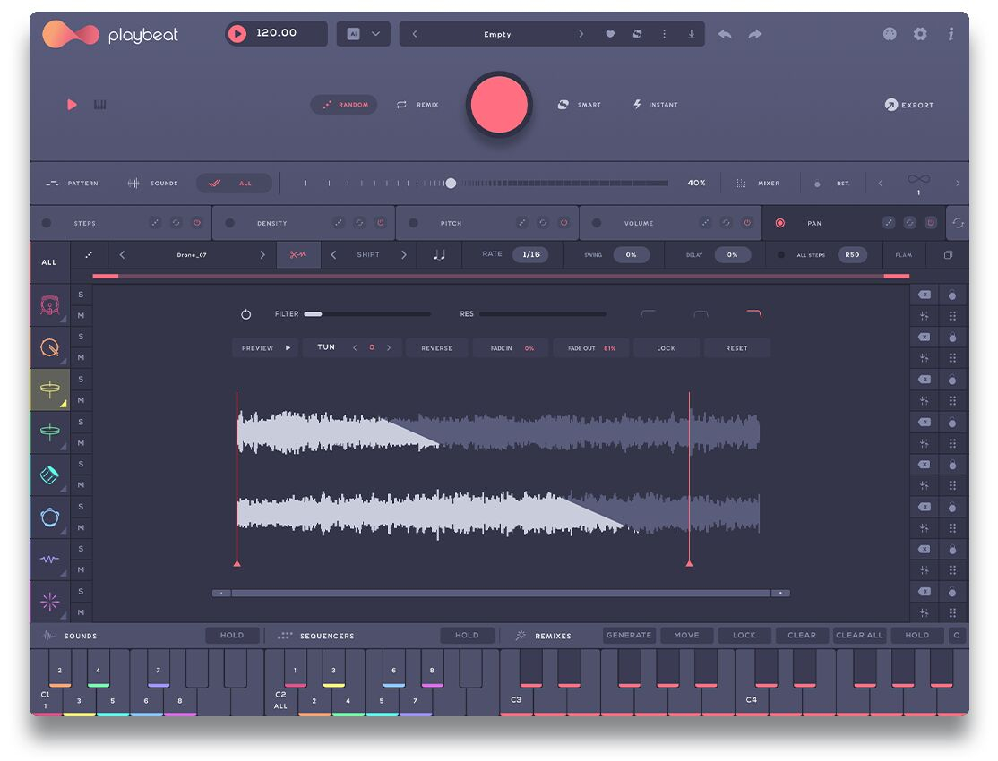REMEZCLA, INTERPRETA Y EDITA Con los algoritmos totalmente nuevos de Playbeat, ahora tienes la opción de crear remezclas ilimitadas de patrones basadas en tu patrón actual y ajustarlas a toda tu canción. Edita tus muestras al momento y genera una nueva y fresca serie de patrones de remezcla una y otra vez... y otra vez. Nuestro teclado multifuncional altamente aclamado te permite activar sonidos individuales, secuencias de patrones o ritmos de batería completos con facilidad.
