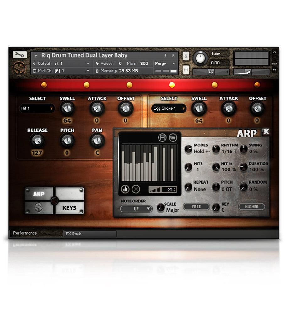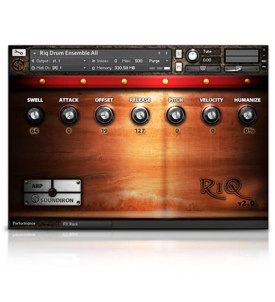 Para nuestra librería de muestras múltiples del Riq Drum, capturamos un par de tambores de tamaño completo, un tambor "daf" de 15 pulgadas más grande de Grecia con anillos y rodamientos de metal (en realidad llamado daf) y un tambor riq más pequeño de 13" de Egipto con "platillos" anchos de hojalata. También capturamos un pandero de juguete que hemos modificado para convertirlo en un riq en miniatura, añadiendo sonajas de huevo. También hemos incluido una colección completa de instrumentos atmosféricos y sostenidos ambientales, cada uno creado completamente mediante una manipulación intensa de las grabaciones originales de esta librería y equipado con opciones de morfado de múltiples capas, modelado de interpretación y encadenamiento de efectos.