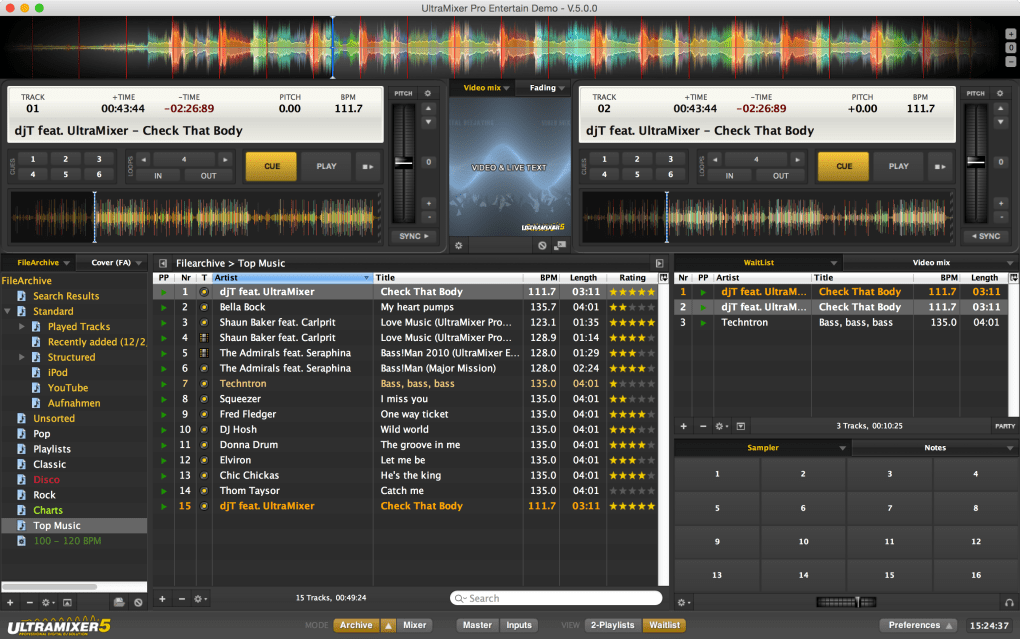UltraMixer 6 Pro Entertain es una aplicación profesional de software para DJ con todas las funciones de entretenimiento que necesitas: deleita a tu público con videos, presentaciones de diapositivas, efectos visuales y texto en vivo mientras reproduces las canciones favoritas de tus invitados. Utiliza tu controlador MIDI favorito para mezclar tu música, configura algunos micrófonos para hacer anuncios e incluso conecta UltraMixer al software de control de iluminación MADRIX. La aplicación remota para smartphones te brinda control sobre tus reproductores mientras disfrutas de un breve descanso de tu portátil. Habilidades de multitarea: sincroniza y mezcla automáticamente tu música entre 4 reproductores mientras agregas puntos de referencia y efectos, preescuchas canciones o cargas títulos en tus listas de reproducción. Incluso puedes integrar a tu audiencia con la ayuda de una cámara en vivo o hacer anuncios mostrando "Texto en vivo" en una pantalla plana o un videowall.