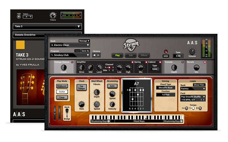 El diseñador de sonido residente Yves Frulla presenta su tercer paquete de sonidos para Strum GS-2, convenientemente titulado Take 3, que incluye 12 estilos, 73 presets de guitarra y 84 patrones de rasgueo que se pueden tocar con tus propias progresiones de acordes. Esta nueva colección presenta esos ritmos de firma temporal poco comunes que has estado buscando, como 3/4, 6/8, 9/8 y 12/8, orientados al rock, blues, pop, country y reggae.