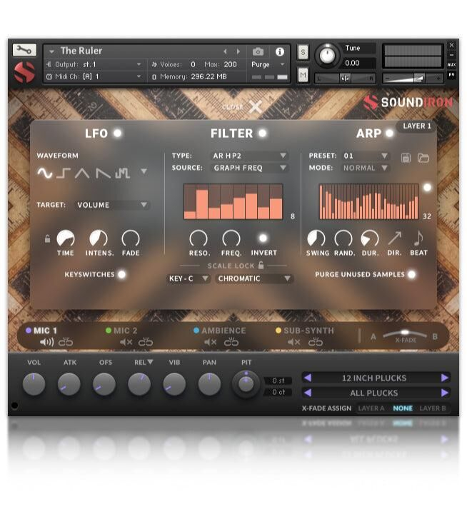 The Ruler incluye más de 24 articulaciones reproducibles, 20 presets de efectos personalizados, 20 ambientes diseñados de sonido, 4825 muestras estéreo y un gigabyte completo de contenido.