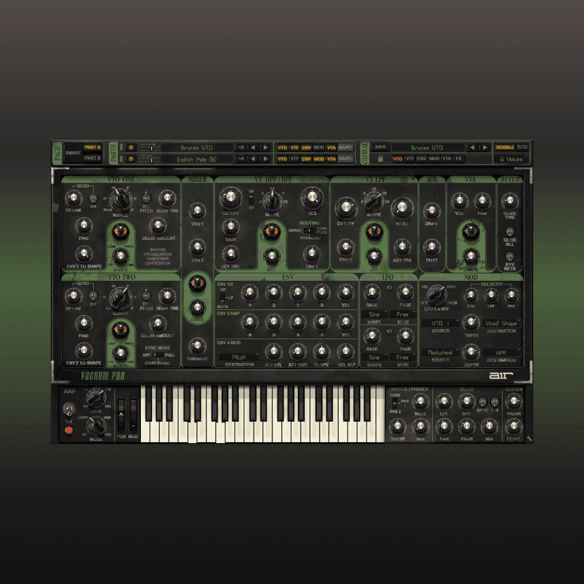 Vacuum Pro es un sintetizador analógico polifónico con modelado de circuitos de tubo de vacío que captura a la perfección el sonido crujiente y cálido de la era analógica. Con cuatro osciladores analógicos, múltiples filtros y envolventes, y efectos de audio integrados, Vacuum Pro te permite adentrarte en la síntesis sustractiva para recrear esos codiciados sonidos analógicos de los años 70 y 80. Ajusta los interruptores, perillas y diales para programar desde bajos, leads, pads, hasta efectos de sonido únicos. Para obtener aún más calidez, Vacuum Pro cuenta con seis circuitos virtuales de tubo de vacío que añaden distorsión y rudeza en cada etapa de la ruta de la señal. Lo analógico acaba de volverse mucho más cálido. Vacuum Pro es una potente combinación de dos partes separadas de sintetizador que se pueden apilar, dividir y superponer para producir sonidos analógicos potentes, amplios y gruesos. Cada parte de Vacuum Pro comienza con dos osciladores de tubo de vacío de amplio rango que se pueden sincronizar, desafinar y ajustar a diferentes niveles de octava. Además, los controles de detune cuádruple por oscilador permiten crear fácilmente sonidos exuberantes. Para obtener un sonido aún más grande, el efecto de Duplicación integrado ensancha y engrosa instantáneamente tu parche. Da forma a tu sonido con dos filtros de tubo de vacío que incluyen un filtro paso bajo tradicional y un filtro paso alto/paso de banda seleccionable. Vacuum Pro también cuenta con cuatro generadores de envolvente, modulación asignable por matriz y un LFO sincronizado con el tempo. El mezclador ofrece un circuito de distorsión y un modulador en anillo para distorsionar el tono. Para un comportamiento analógico auténtico, los controles de Age te permiten manipular la desviación y añadir ruido a tus sonidos.