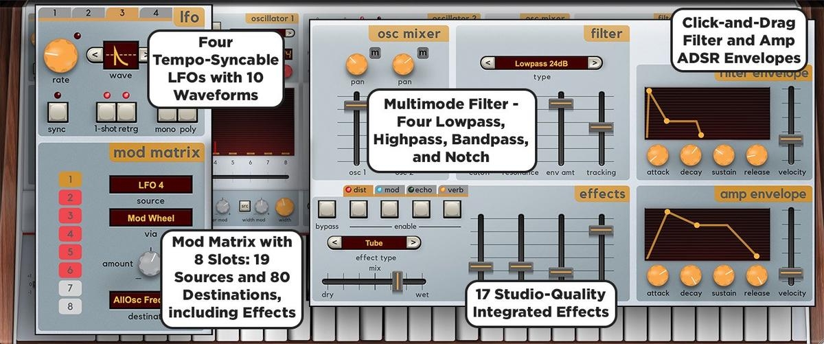 Harmonia alcanza nuevas alturas al proporcionar cuatro LFO sincronizables, un amplio filtro multimodo, envolventes arrastrar y soltar, y una matriz de modulación masiva con ocho ranuras para docenas de fuentes y destinos. Harmonia incluye soporte para aftertouch, mapeo MIDI flexible y una colección de más de 350 impresionantes presets diseñados profesionalmente. Harmonia también cuenta con 17 efectos de calidad de estudio como distorsión, coro, fase, ecos, reverberaciones y más, todos ellos completamente modulables a través de la matriz.