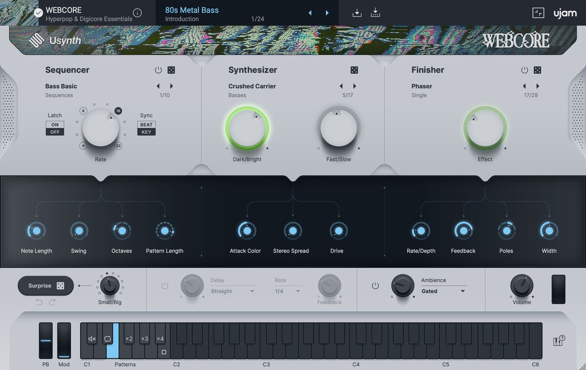 WEBCORE es un Usynth juguetón y glitcheado para géneros caóticos y modernos como el Glitch Pop, Hyperpop, Digicore y Botanica. Sus sonidos son orgullosamente sintéticos: metálicos, limpios y digitales en lugar de acústicos o retro. WEBCORE es el compañero estilístico perfecto para Beatmaker CHROMED.