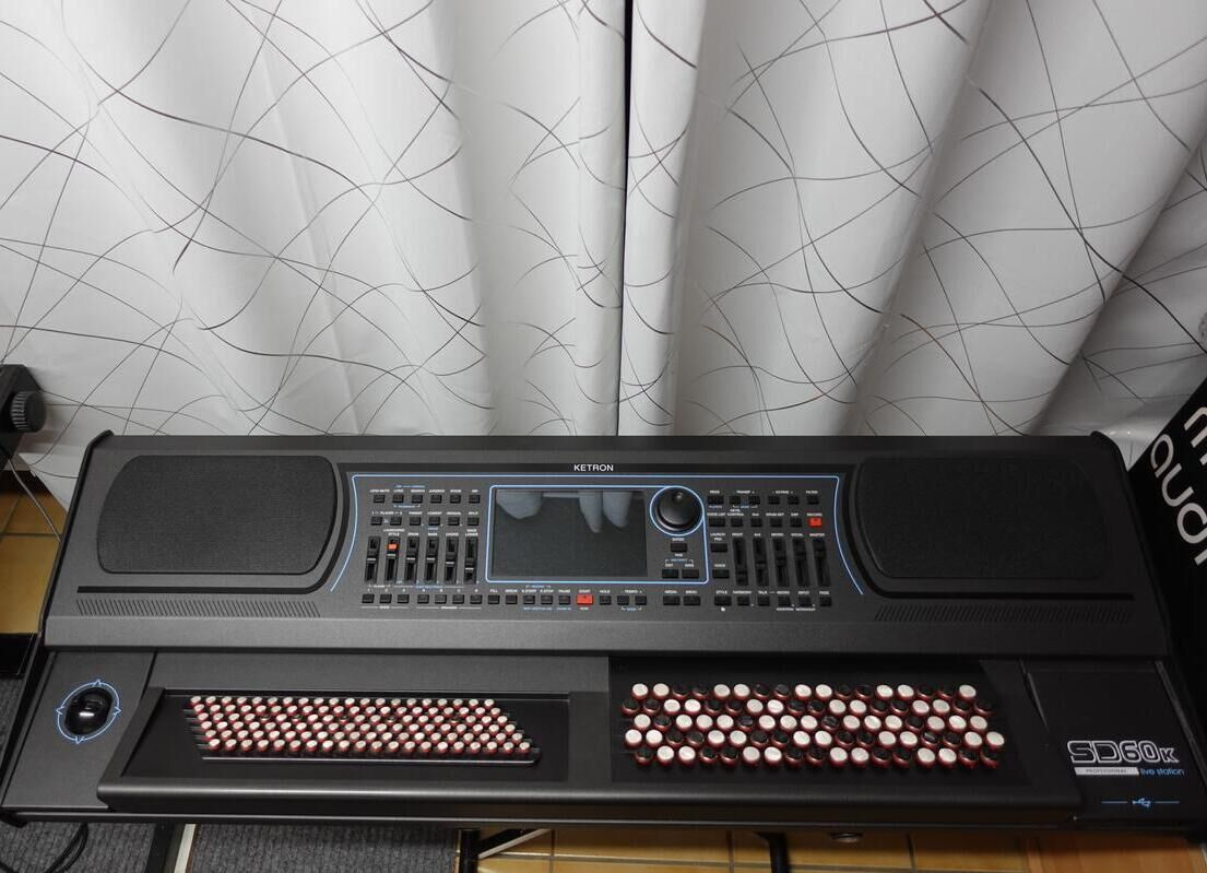 Arranger de alta gama Ketron SD60K (teclado de botones de acordeón): motor SD-Series con baterías de audio "Real Drums", guitarras en vivo, estilos "Live Band/Unplugged", reproductor multimedia y Launchpad para ensamblar tus secuencias. Teclado cromático de botones (52 botones en la mano derecha, 120 bajos en la mano izquierda) con aftertouch, pantalla táctil a color de 7", amplificación integrada de 2 x 20 W, grabación de audio/MIDI, reproductor de múltiples pistas (hasta 6 pistas de audio simultáneas) y amplia biblioteca de sonidos y estilos. Diseñado para solistas de orquesta, animadores y escenario.