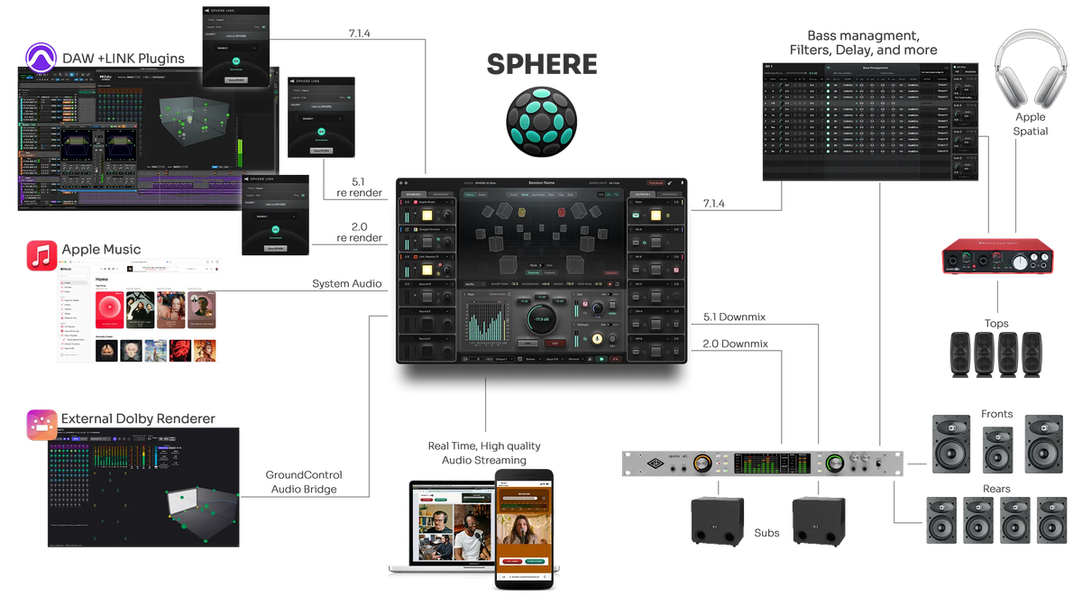 SPHERE es una potente solución de monitoreo de software para sonido estéreo, surround e inmersivo, que admite disposiciones de altavoces de hasta 9.4.6. Los usuarios pueden monitorear hasta ocho conjuntos de altavoces simultáneamente, y cualquier salida puede dirigirse a todos los altavoces o a un subconjunto de altavoces. Los usuarios también pueden configurar y referenciar diferentes sistemas de altavoces. SPHERE permite a los usuarios enrutar audio desde DAW, Dolby Renderer, Apple Music, Tidal u cualquier otra plataforma de streaming, con fines de referencia. SPHERE permite a los usuarios de la funcionalidad de su amplio puente de audio virtual introducir hasta ocho fuentes de audio de cualquier tipo. SPHERE cuenta con procesamiento de corrección integrada de la sala, ofreciendo un completo manejo de graves y alineación de tiempo y nivel para cada altavoz. Los usuarios pueden utilizar cualquiera de sus plugins EQ favoritos en cualquier salida de altavoz. También pueden utilizar múltiples instancias de su plugin de corrección de sala en cualquier salida. Características:* Ocho entradas, cada una se puede configurar desde formatos de 2.0 hasta 9.4.6.* Mezcla integrada de estéreo, mono y laterales.* Siete salidas de altavoz de cualquier configuración.* Bus CUE.* Compatible con todos los dispositivos de audio principales - se pueden asignar hasta 16 dispositivos de audio diferentes.* Talk Back, Listen Back.* Amplio medidor.* Manejo de graves.* Hospedaje de plugins AU.* Control remoto con MIDI y teclas de acceso rápido.* Soporte AVID Eucon.* Soporte para Stream Deck y Stream Deck plus.