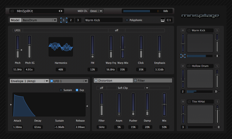 Este versátil plug-in cuenta con 3 algoritmos de síntesis de batería únicos, que permiten crear una amplia gama de sonidos impactantes. Además, MiniSpillage está equipado con poderosos efectos de distorsión y filtros resonantes para añadir textura y color a tus percusiones.