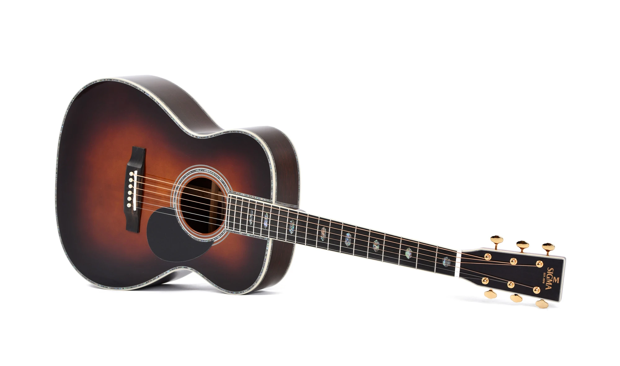 Le modèle SOMR-45-SB se distingue par sa finition sunburst brillant, qui met en valeur la beauté naturelle du bois. Les mécaniques ouvertes Grover dorées garantissent une excellente stabilité d’accordage et une esthétique raffinée. Le sillet de tête de 44.5 mm en os et les sillets en os contribuent à une meilleure transmission des vibrations et à une sonorité optimale.