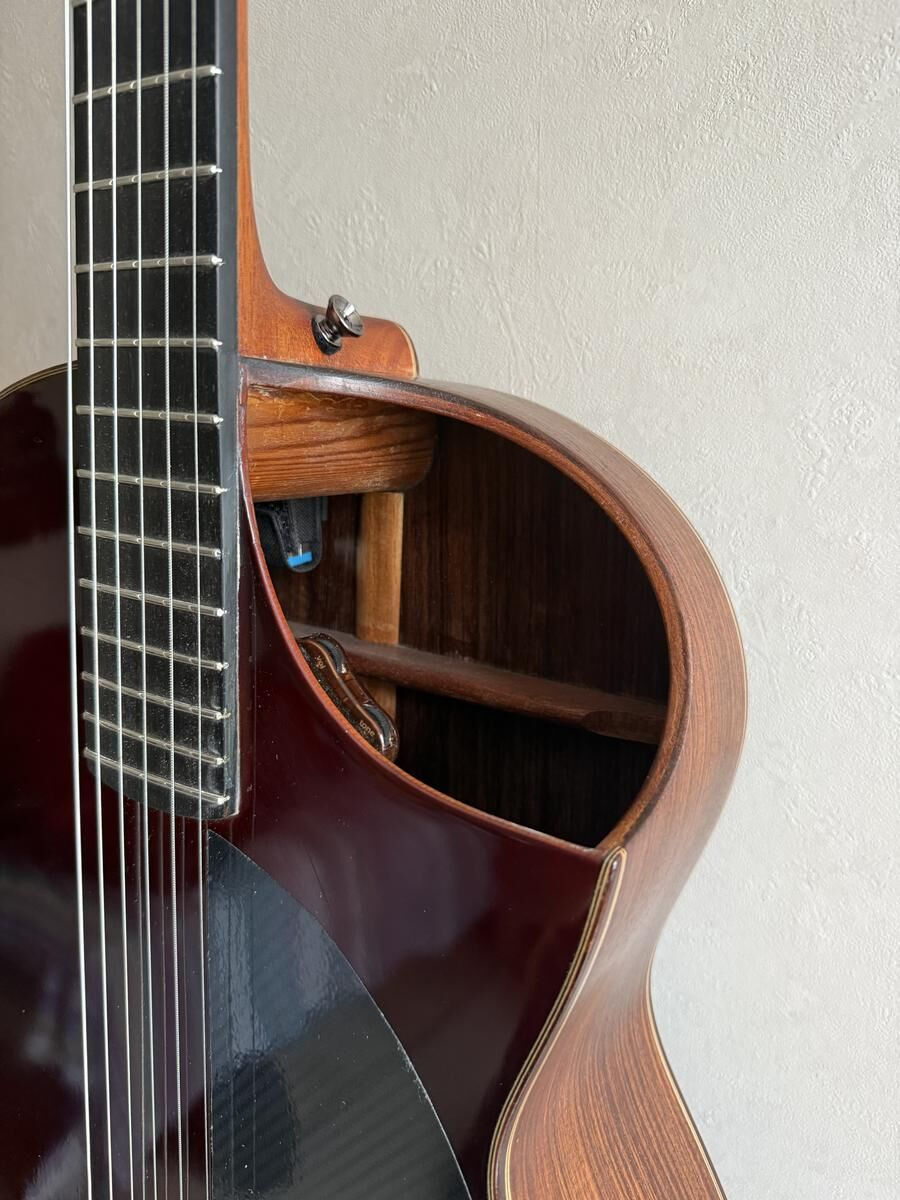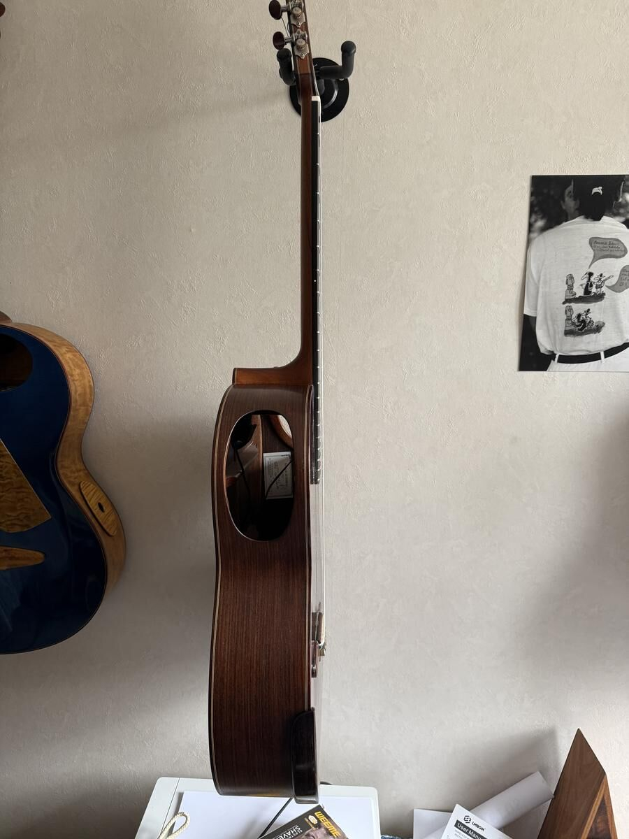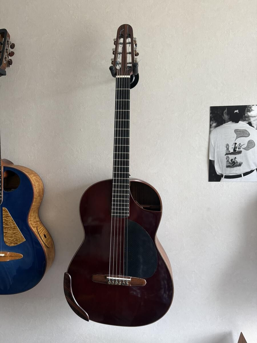 Guitare réalisé par le Luthier Gérard Audirac en 2012, totalement rénovée et embellie par le Luthier Pierre-Marc Martelli en 2022, le vernis, totalement refait, le manche à été retravaillé, la tête initialement plate à été modifiée ainsi que l'ensemble des mécaniques changée.