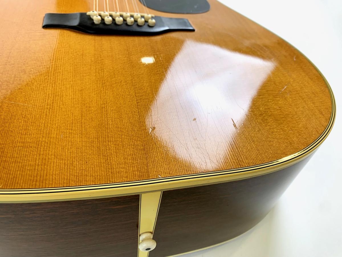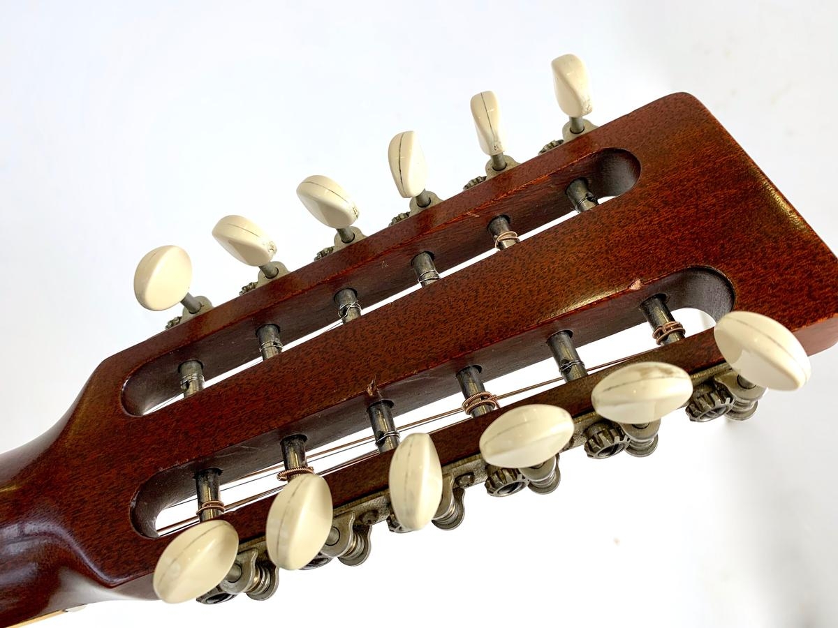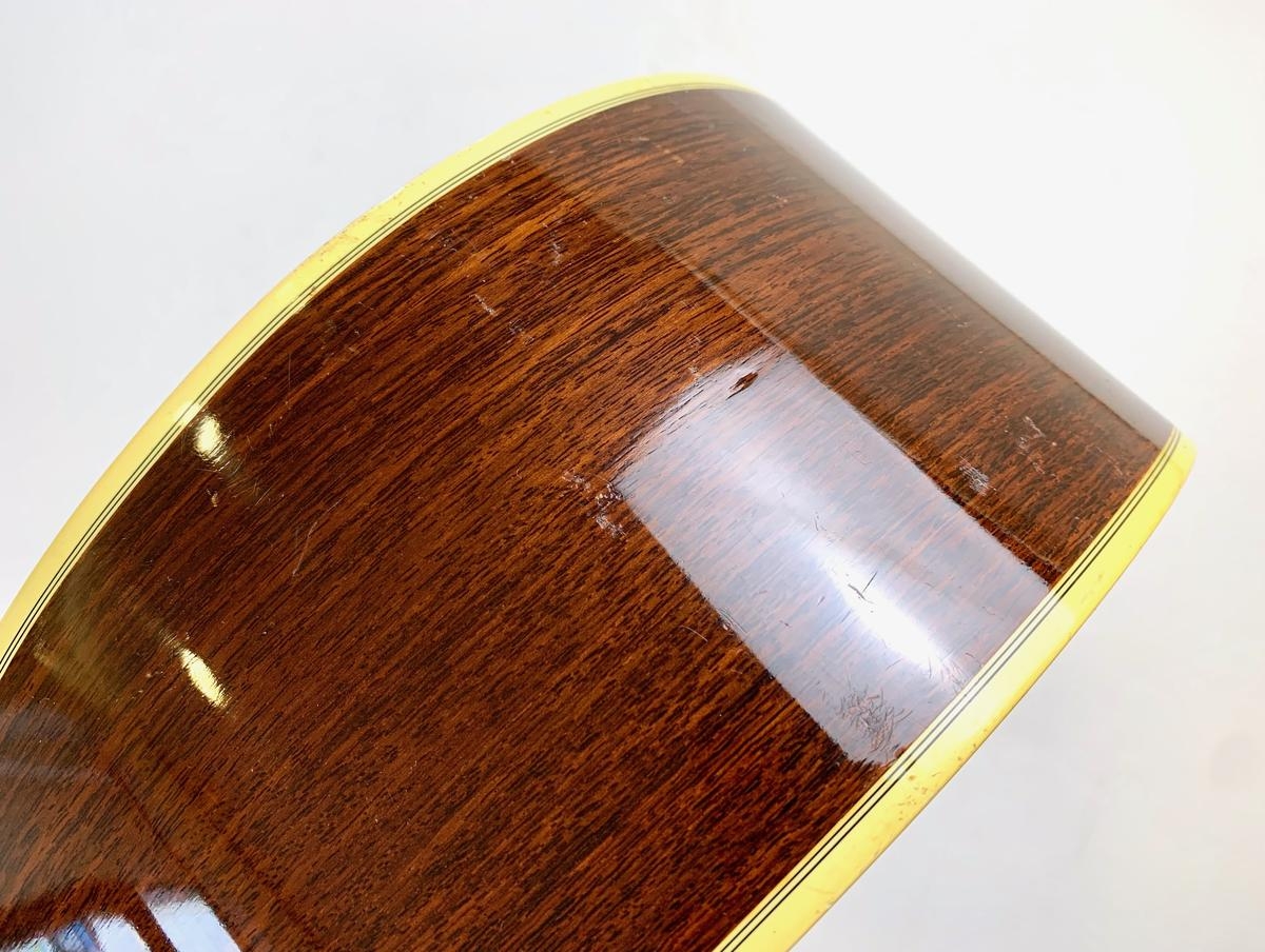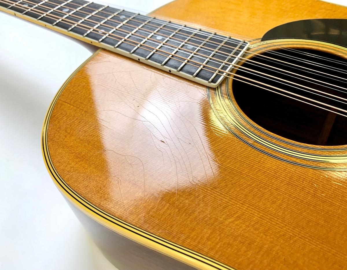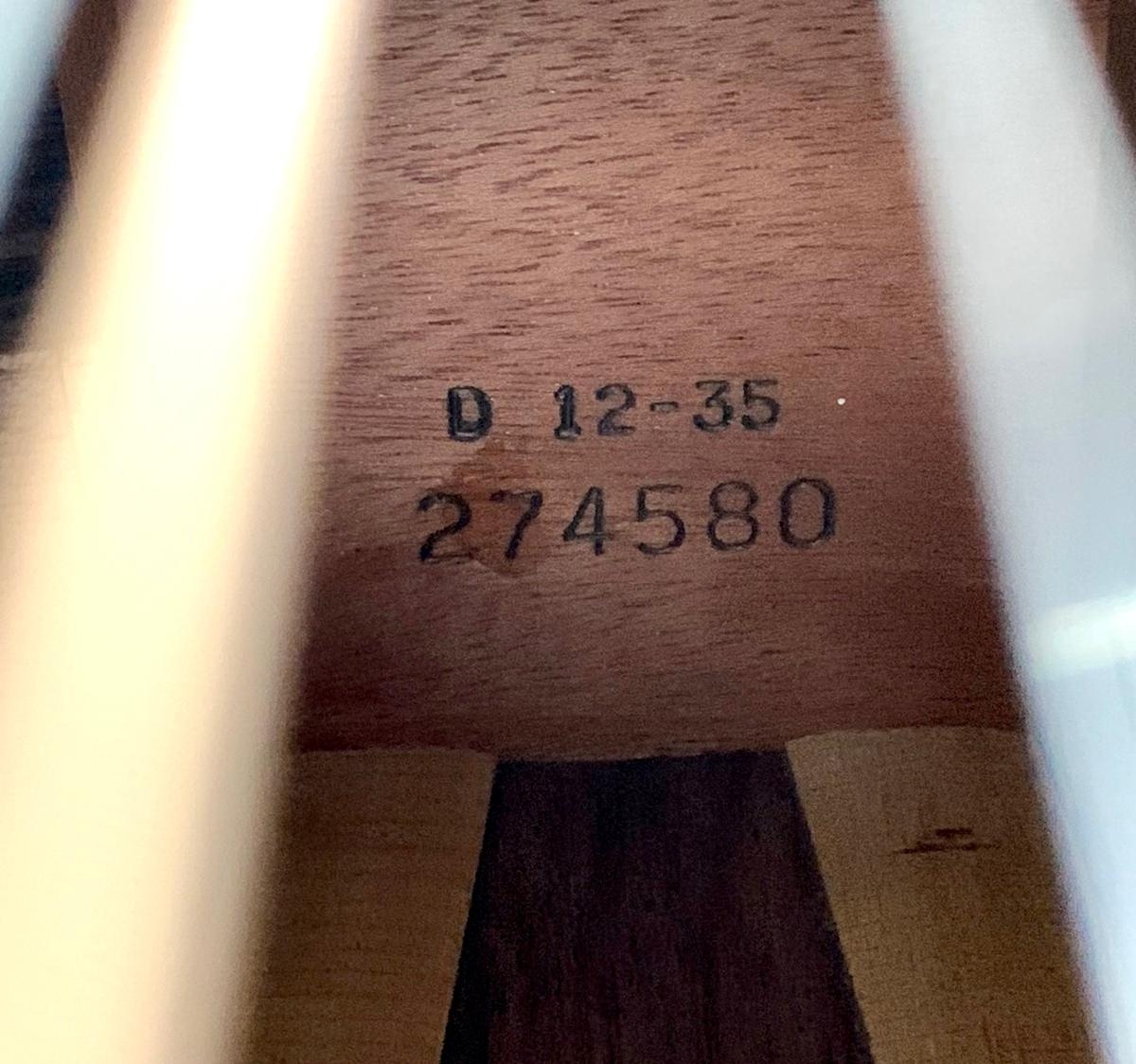Proche de la D-28, la 35 a été crée en 1965 ; tout comme sa version 12 cordes ! Le dos en trois parties ainsi que les éclisses sont faits de palissandre, la table est en épicéa, le manche, en acajou et la touche ainsi que le chevalet en ébène. On notera parmi les détails sympathiques, la tête ajourée. Elle porte bien sûr des marques de son utilisation au cours des 50 dernières années. Grâce à un neck reset, certes ancien : fait en 1981 à l’usine de Nazareth, elle est parfaitement jouable !
