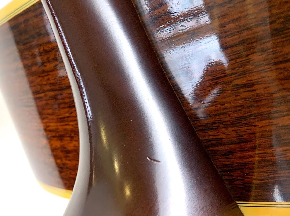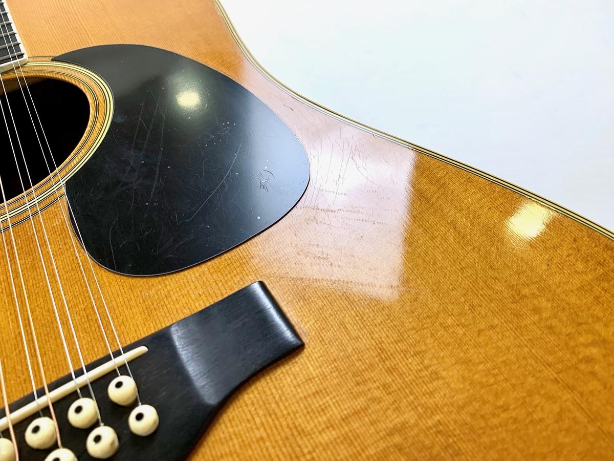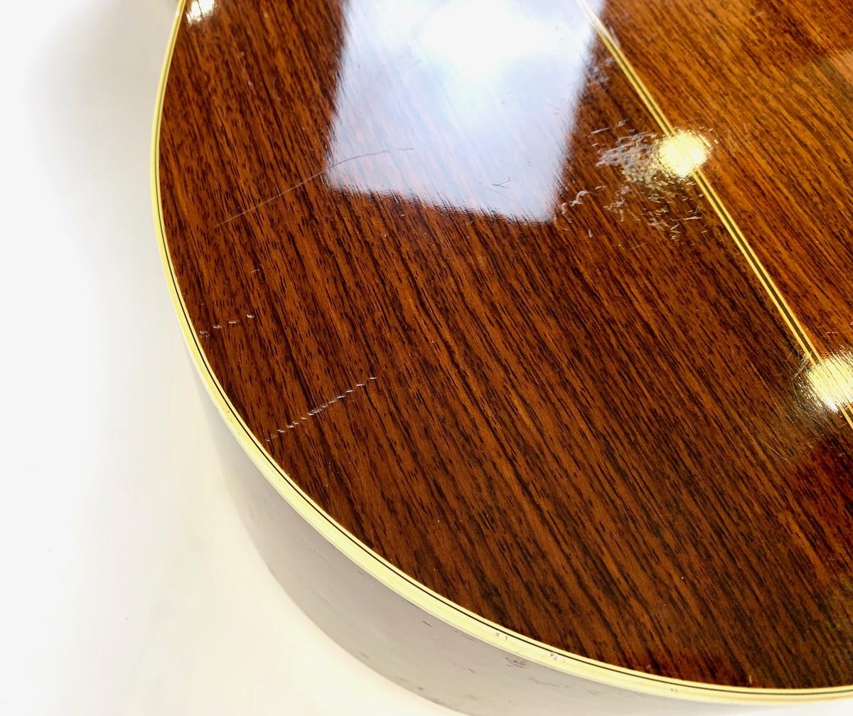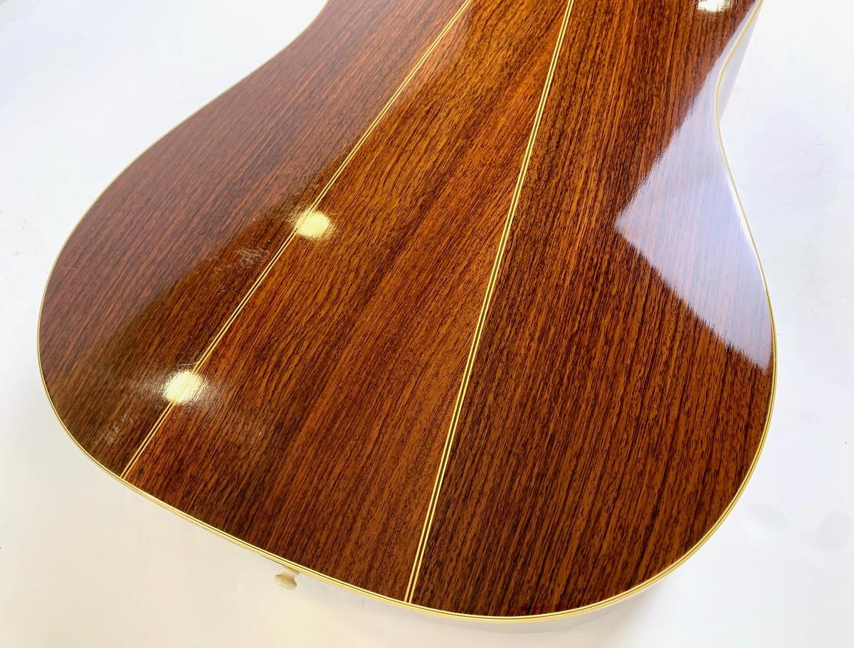 Proche de la D-28, la 35 a été crée en 1965 ; tout comme sa version 12 cordes ! Le dos en trois parties ainsi que les éclisses sont faits de palissandre, la table est en épicéa, le manche, en acajou et la touche ainsi que le chevalet en ébène. On notera parmi les détails sympathiques, la tête ajourée. Elle porte bien sûr des marques de son utilisation au cours des 50 dernières années. Grâce à un neck reset, certes ancien : fait en 1981 à l’usine de Nazareth, elle est parfaitement jouable !