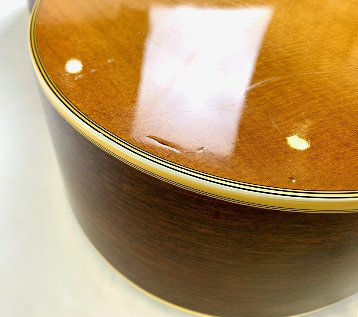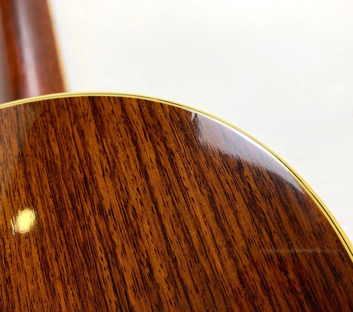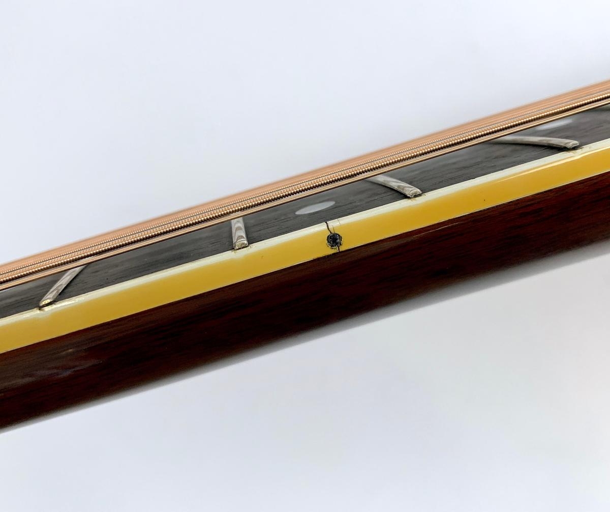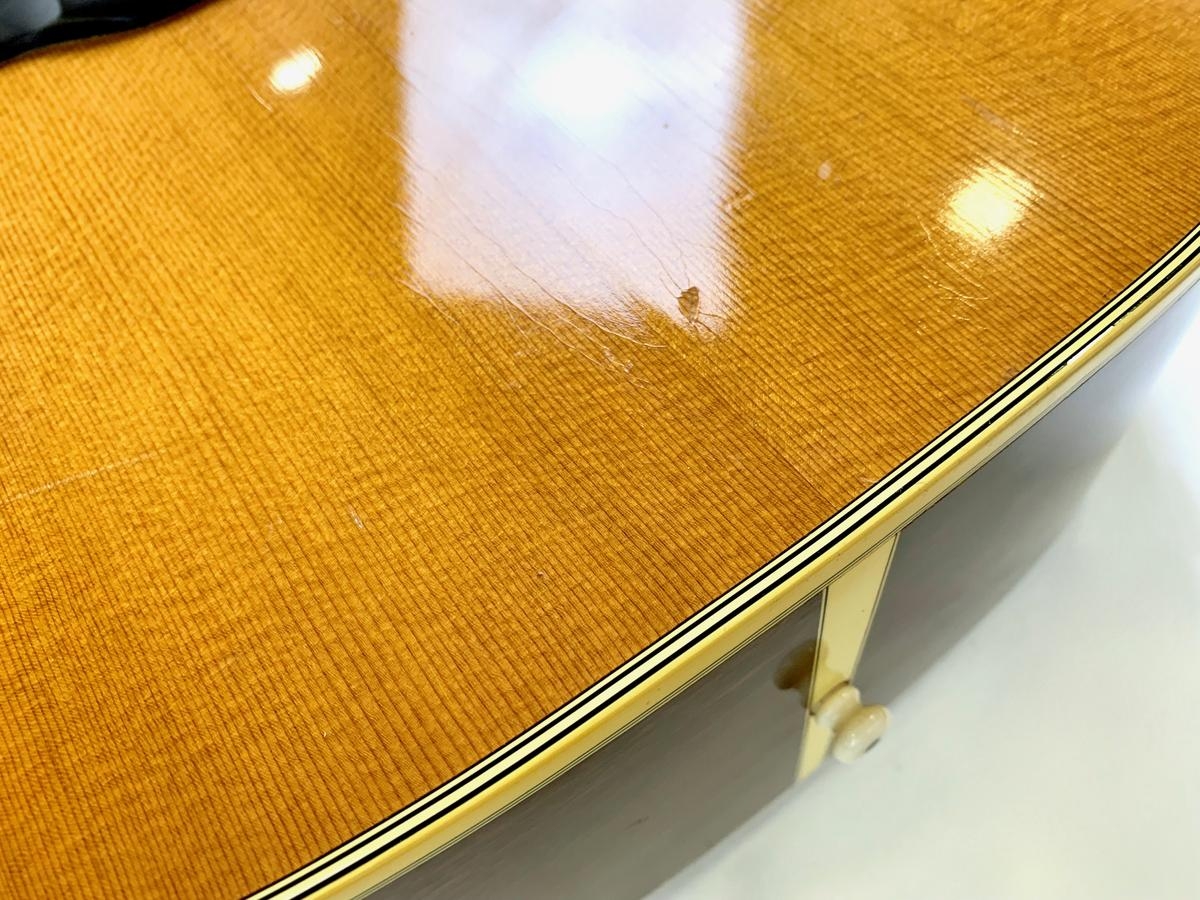 Proche de la D-28, la 35 a été crée en 1965 ; tout comme sa version 12 cordes ! Le dos en trois parties ainsi que les éclisses sont faits de palissandre, la table est en épicéa, le manche, en acajou et la touche ainsi que le chevalet en ébène. On notera parmi les détails sympathiques, la tête ajourée. Elle porte bien sûr des marques de son utilisation au cours des 50 dernières années. Grâce à un neck reset, certes ancien : fait en 1981 à l’usine de Nazareth, elle est parfaitement jouable !