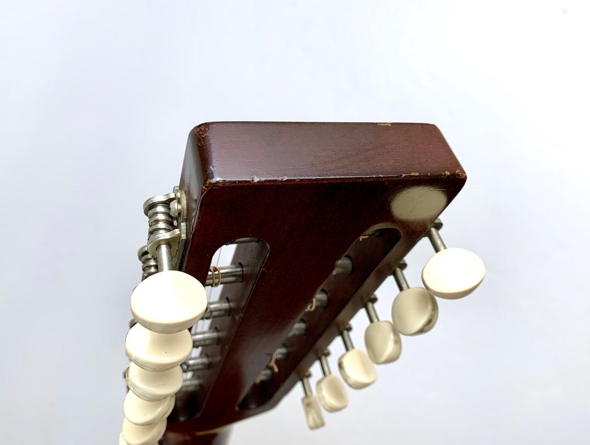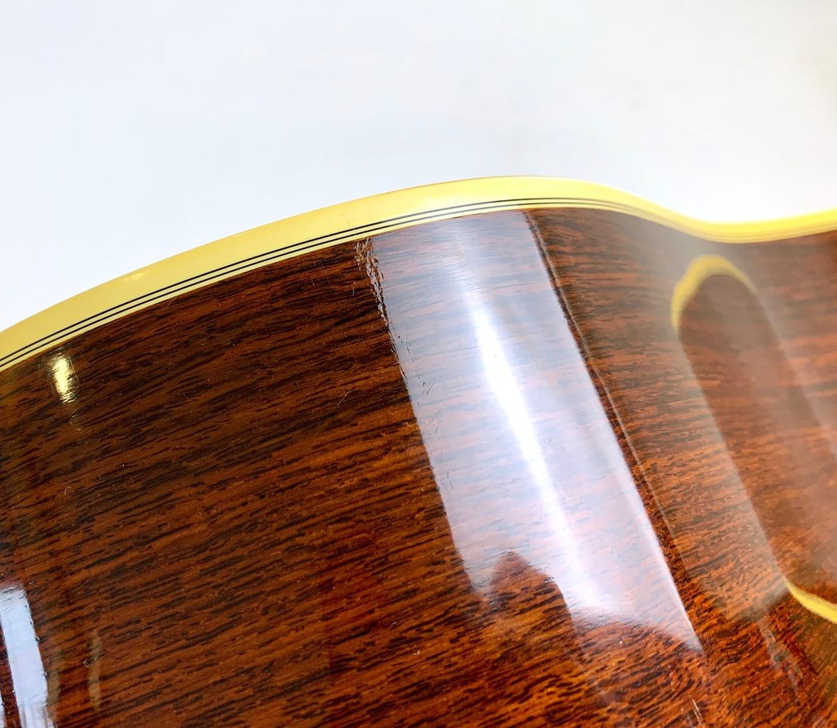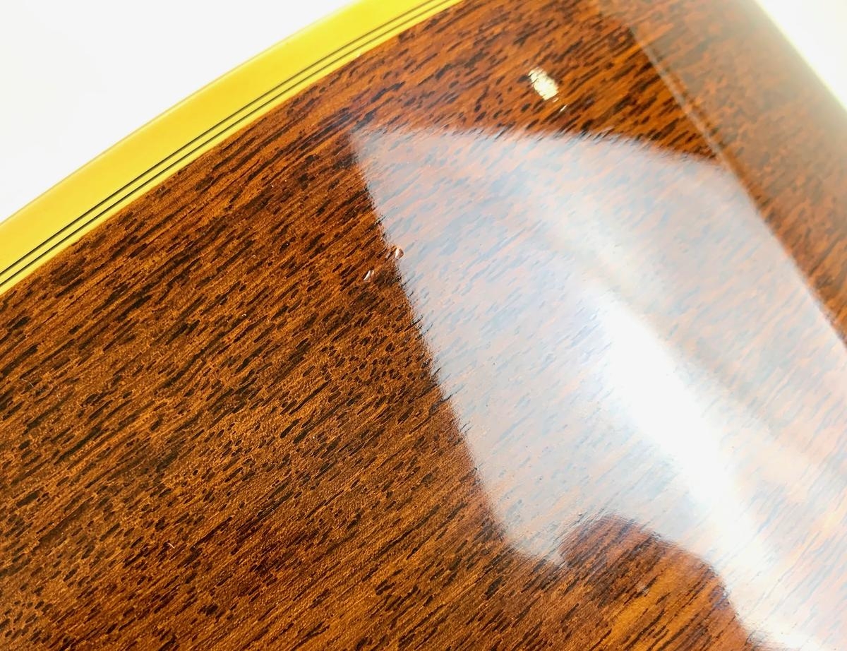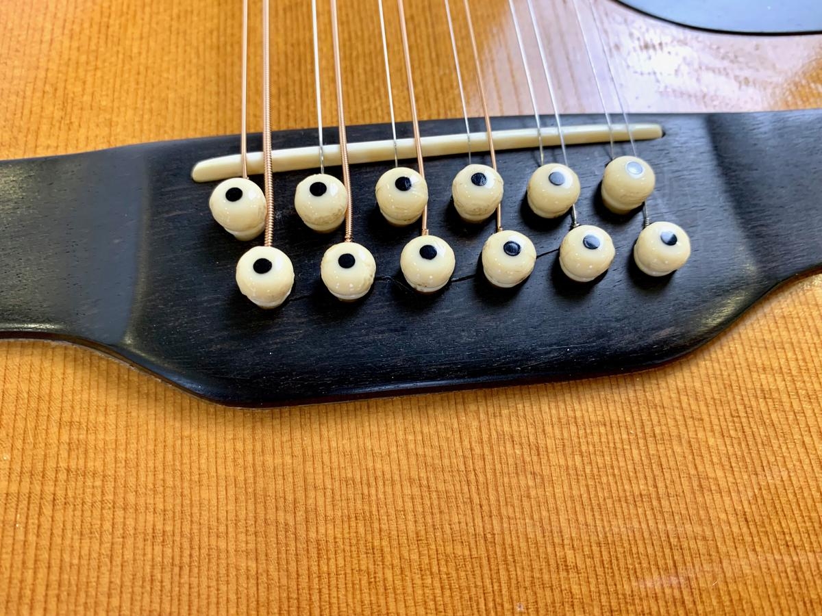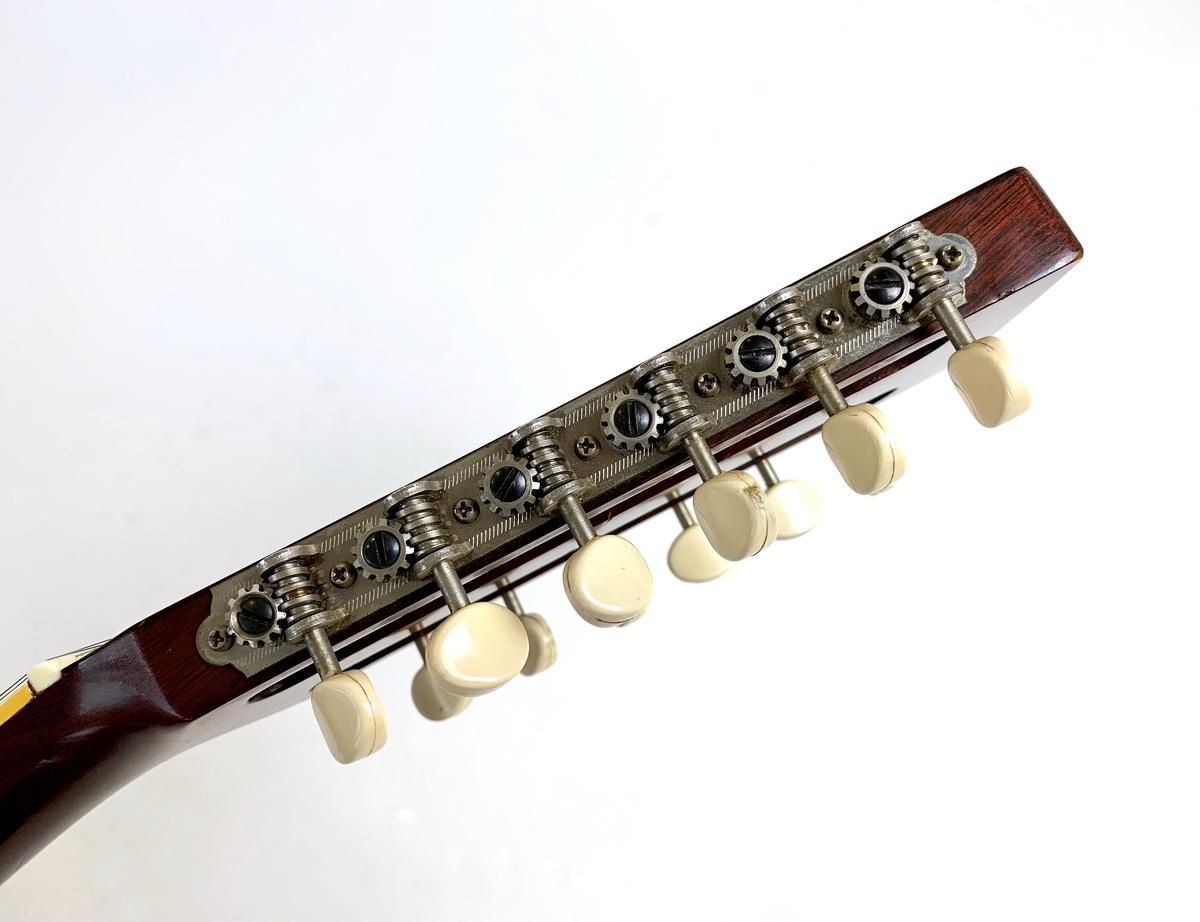 Proche de la D-28, la 35 a été crée en 1965 ; tout comme sa version 12 cordes ! Le dos en trois parties ainsi que les éclisses sont faits de palissandre, la table est en épicéa, le manche, en acajou et la touche ainsi que le chevalet en ébène. On notera parmi les détails sympathiques, la tête ajourée. Elle porte bien sûr des marques de son utilisation au cours des 50 dernières années. Grâce à un neck reset, certes ancien : fait en 1981 à l’usine de Nazareth, elle est parfaitement jouable !
