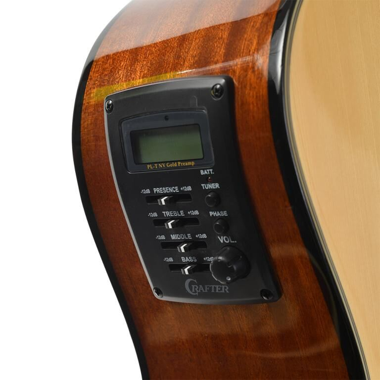 - Electronique: Transducteur CR-T NV sous sillet, préamplificateur avec accordeur chromatique intégré, réglages de volume, présence, basses, médiums et aigus, phase, indicateur de batterie faible et jack de sortie de 6,35 mm (1/4").