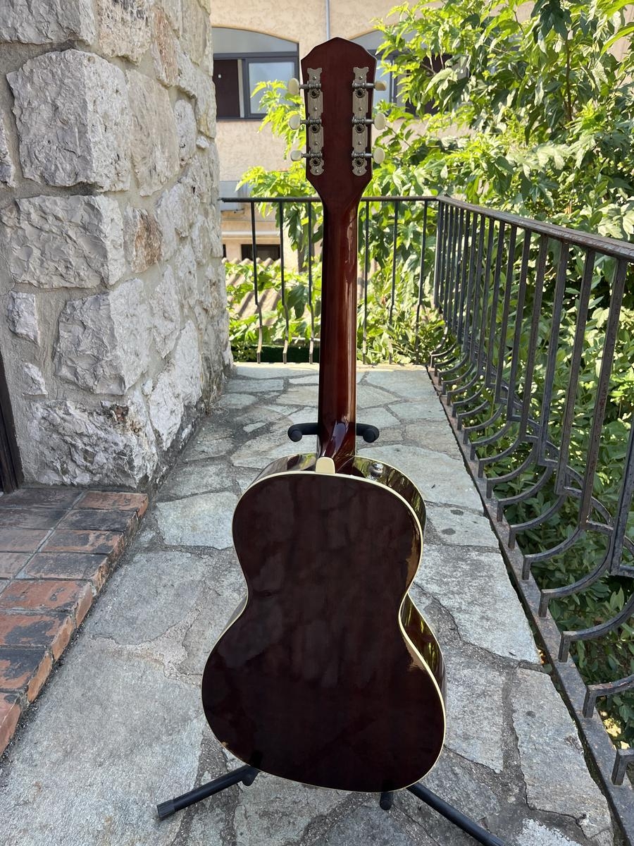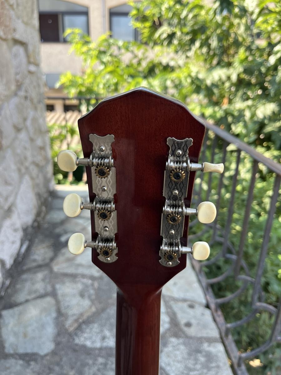 Cette guitare acoustique à 6 cordes, de type parlor, est spécialement conçue pour offrir une réponse et une résonance exceptionnelles malgré sa taille compacte. Grâce à son étui, elle se maintient en bon état, bien que nécessitant un nettoyage et un changement de cordes pour retrouver sa brillance sonore originale.