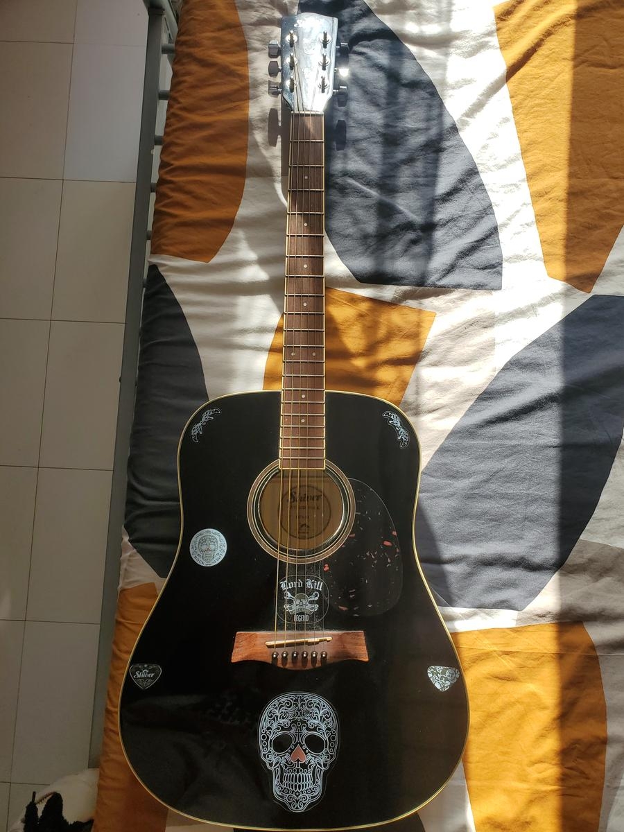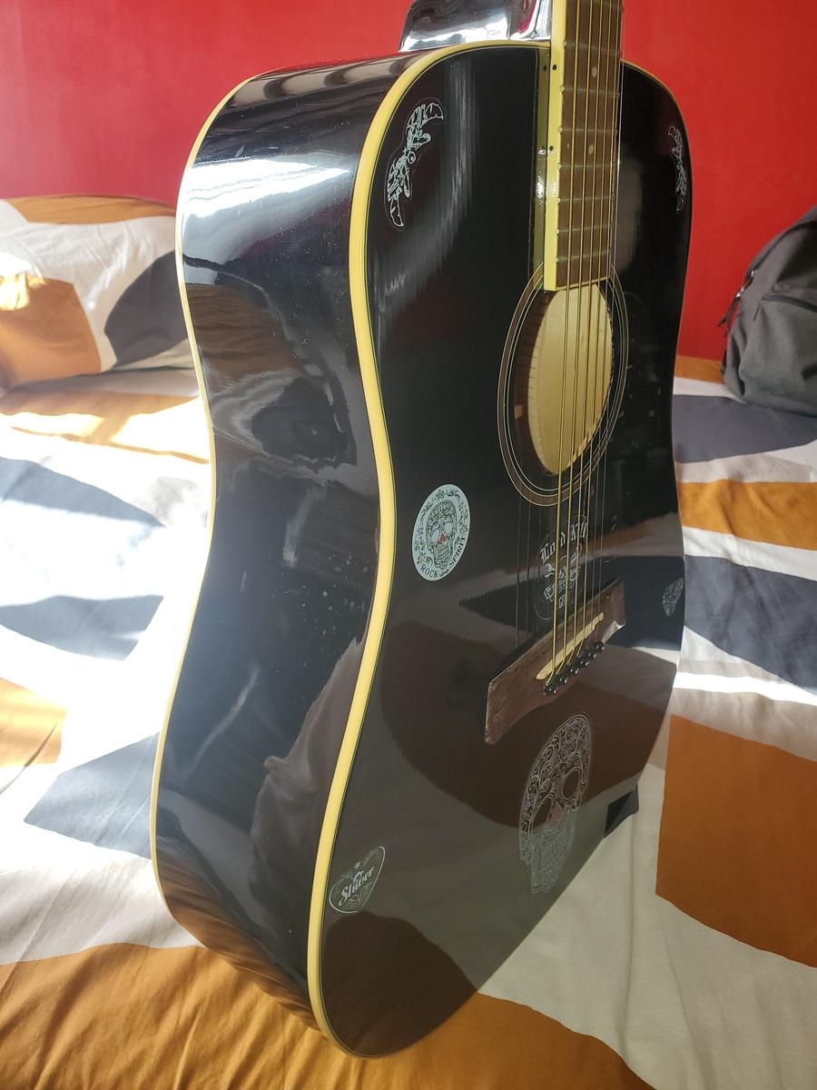 Guitare acoustique folk au look affirmé, idéale pour débuter ou progresser avec style. Ce modèle dreadnought offre une bonne projection sonore et une jouabilité confortable. Elle présente des décorations adhésives (retrait possible) qui lui confèrent une personnalité visuelle unique. Quelques rayures visibles à l’arrière du corps, sans incidence sur le jeu. Cordes d’origine encore en bon état. Vendue avec sa housse et deux boîtes de médiators.