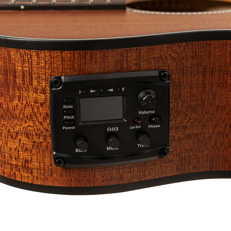 - Système préampli actif: Micro sous sillet, préampli G03 avec EQ, contrôle de volume, basses, médiums et aigus, accordeur chromatique intégré, sélecteur de phase et témoin de charge de batterie