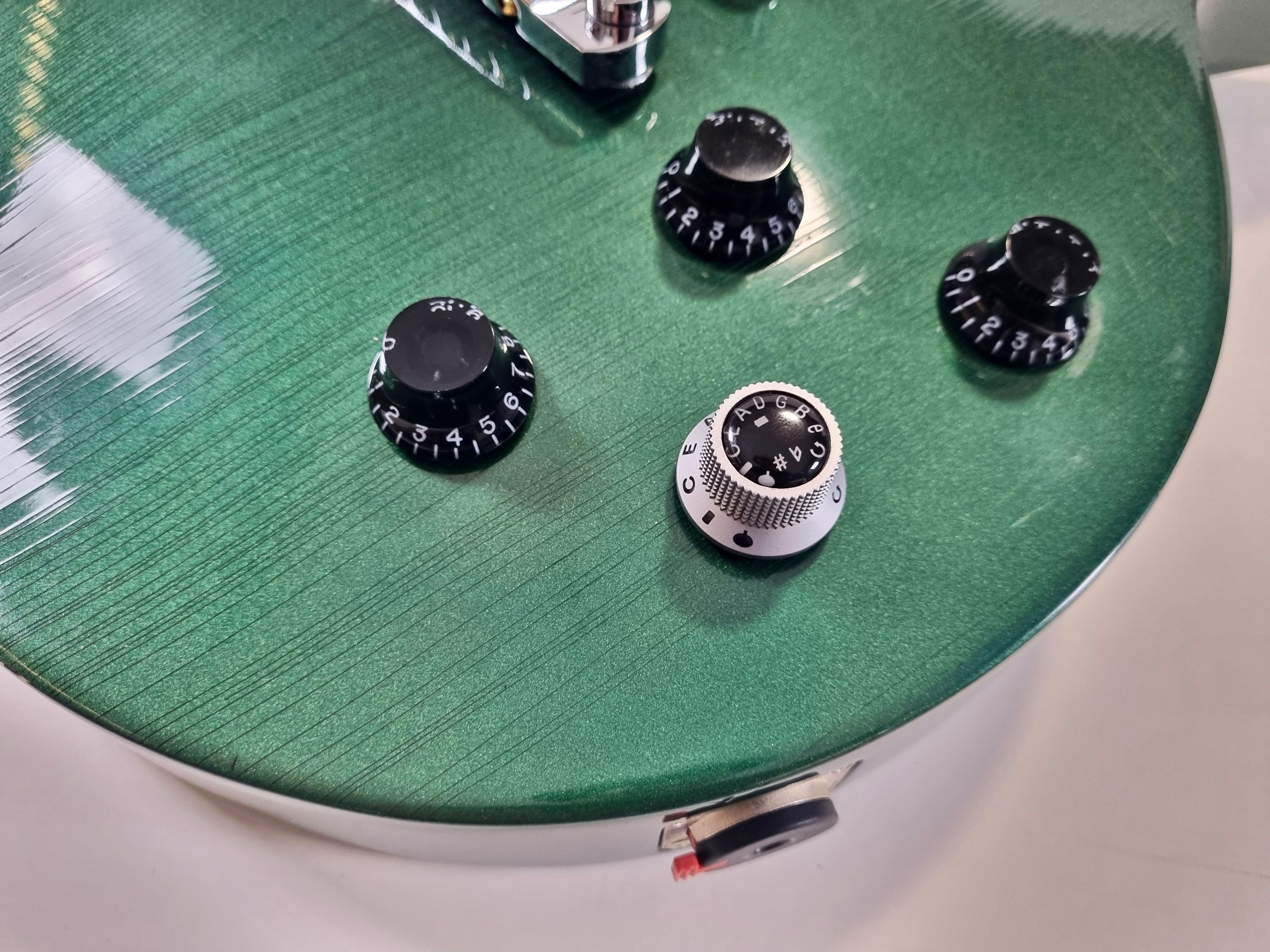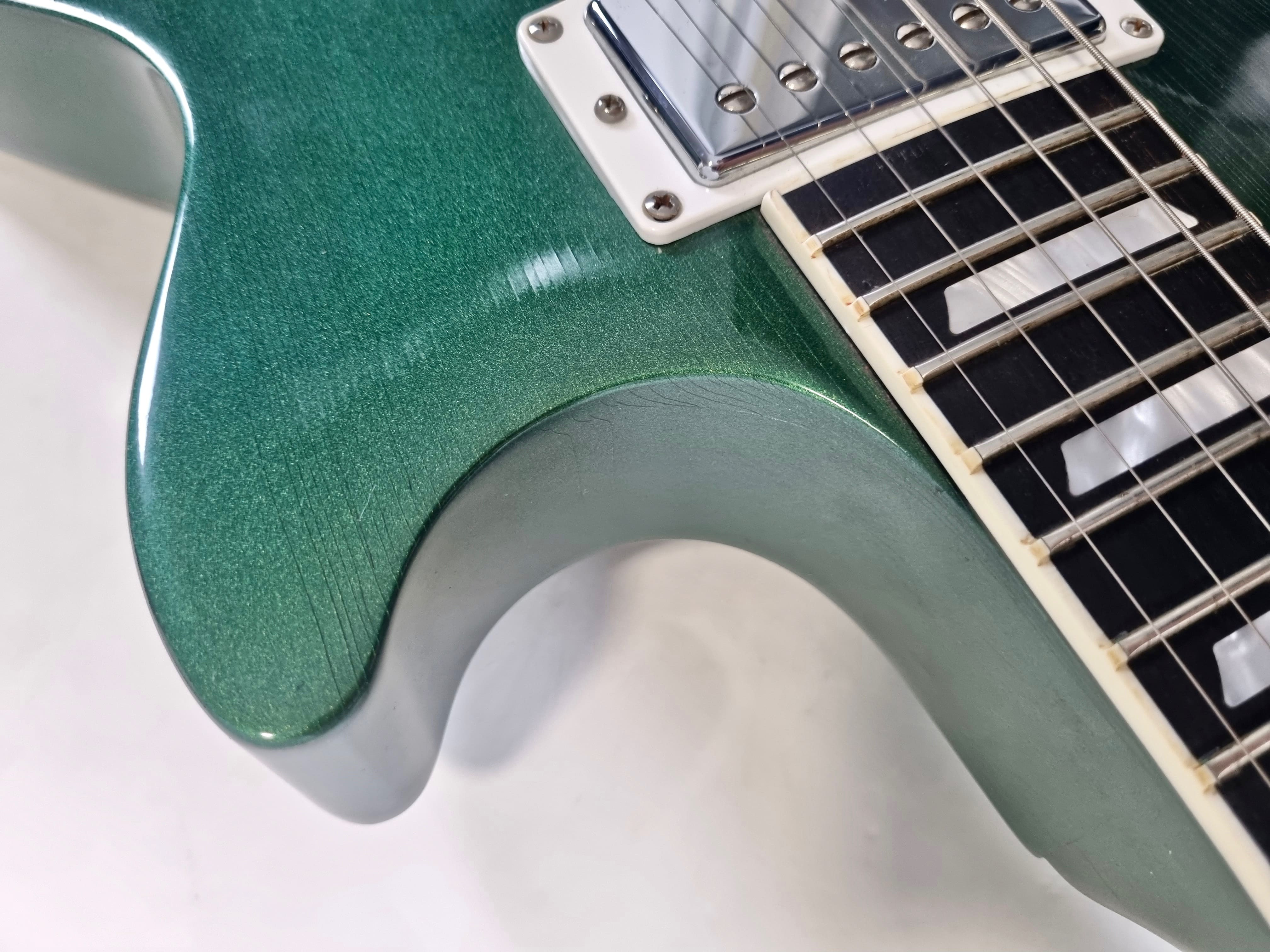 Elle est équipée d’un duo de micros emblématique : un 490R doux et rond en position manche, et un 498T puissant au chevalet. La finition Metallic Green commence à développer une superbe patine avec un vernis qui se craquelle joliment (lacquer checking). Tout est d’origine et elle est livrée dans son étui rigide.