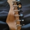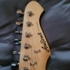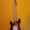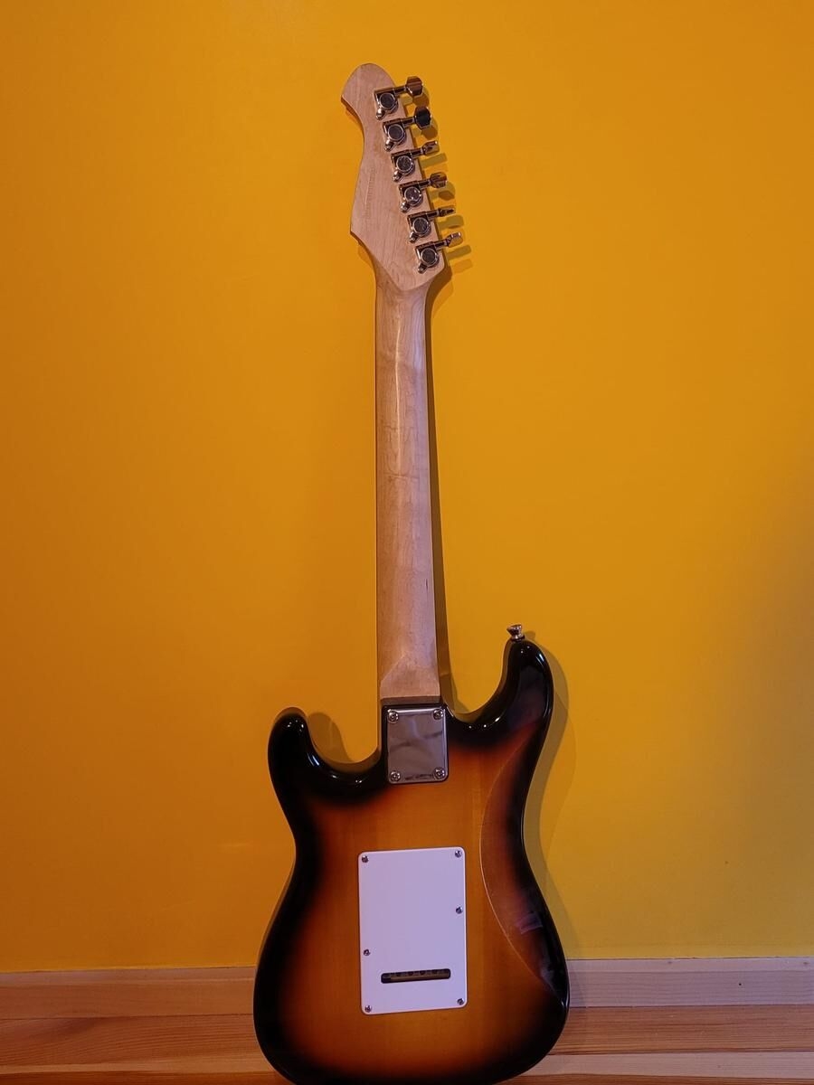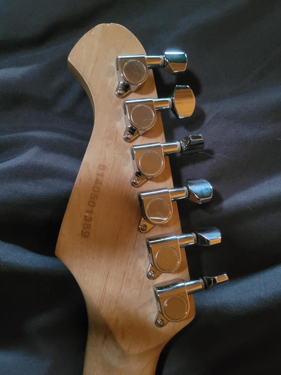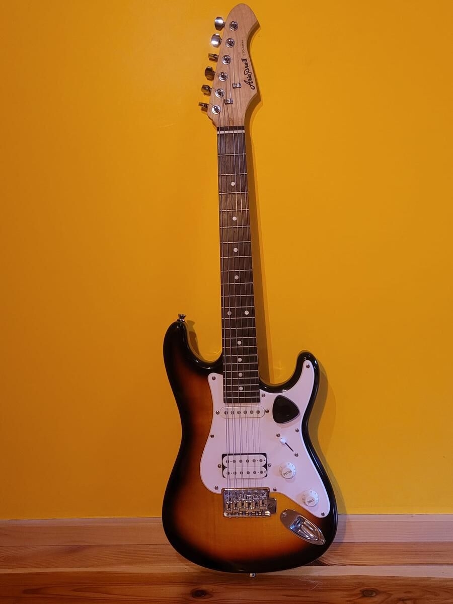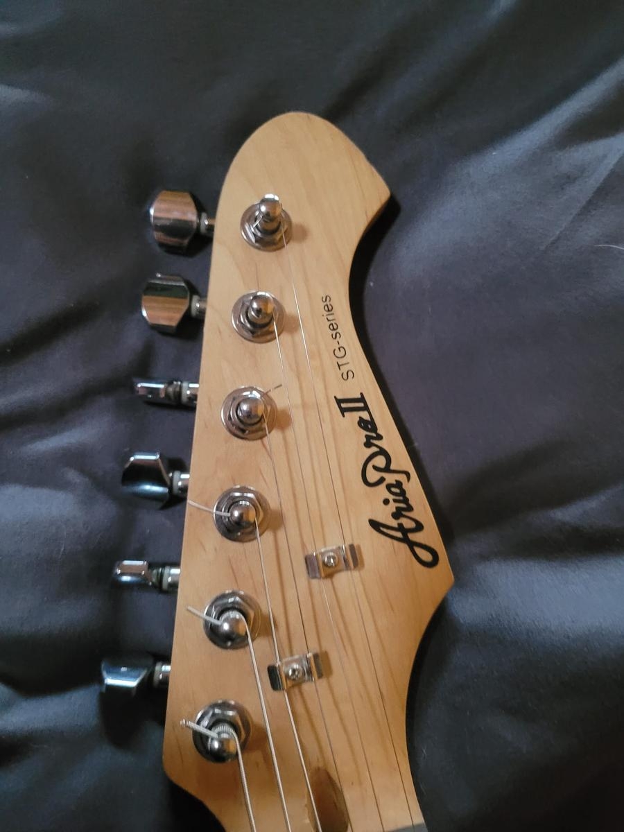 Cette Aria Pro II est une guitare électrique au look vintage inspiré du modèle Stratocaster, fabriquée au Japon, probablement dans les années 1980. Elle affiche une superbe finition sunburst avec un pickguard blanc et une tête typique des modèles de la marque.