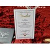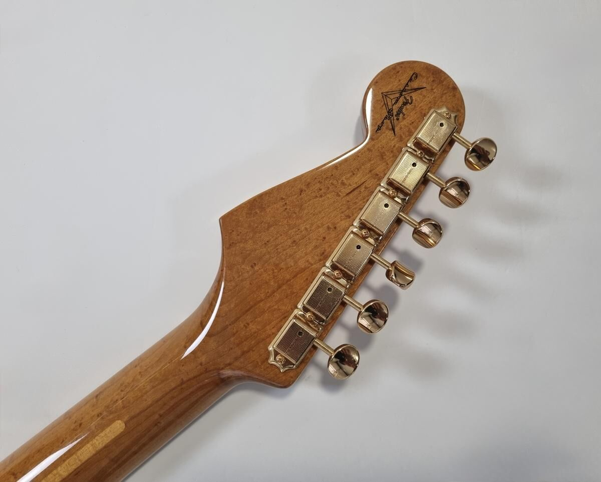 Cette Strat Artisan fait partie d'une série extrêmement limitée du Custom Shop. Sa particularité réside principalement dans l'utilisation d'un magnifique corps en noyer. Le manche est également remarquable avec une superbe pièce d'érable AAA birdseye en profil 10/56 en forme de V et un rayon de 9,5 pouces. Les micros sont des Fat 50's fabriqués à la main. Cette guitare est en excellent état et est vendue avec son certificat d'authenticité dans son étui d'origine.