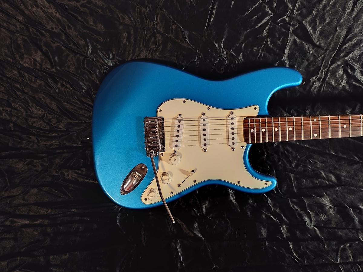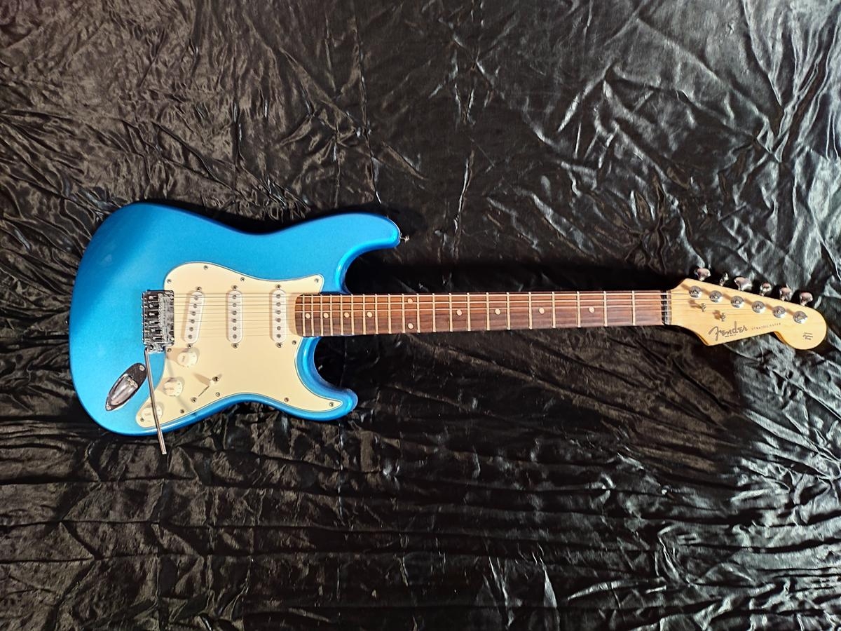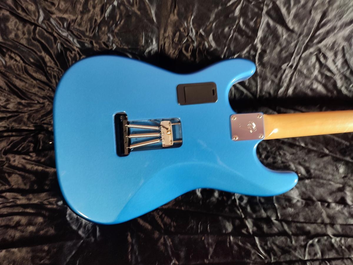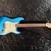Je mets en vente une Fender Stratocaster modifiée, corps Fender USA (corps aulne), manche remplacé par un manche Japan de chez Fred's guitar radius 9,5", hard fret 18% medium jumbo, chevalet Gotoh 510 bloc acier, micros GFS neodymium, mécaniques à blocages. Corps repeint en Metallic blue.