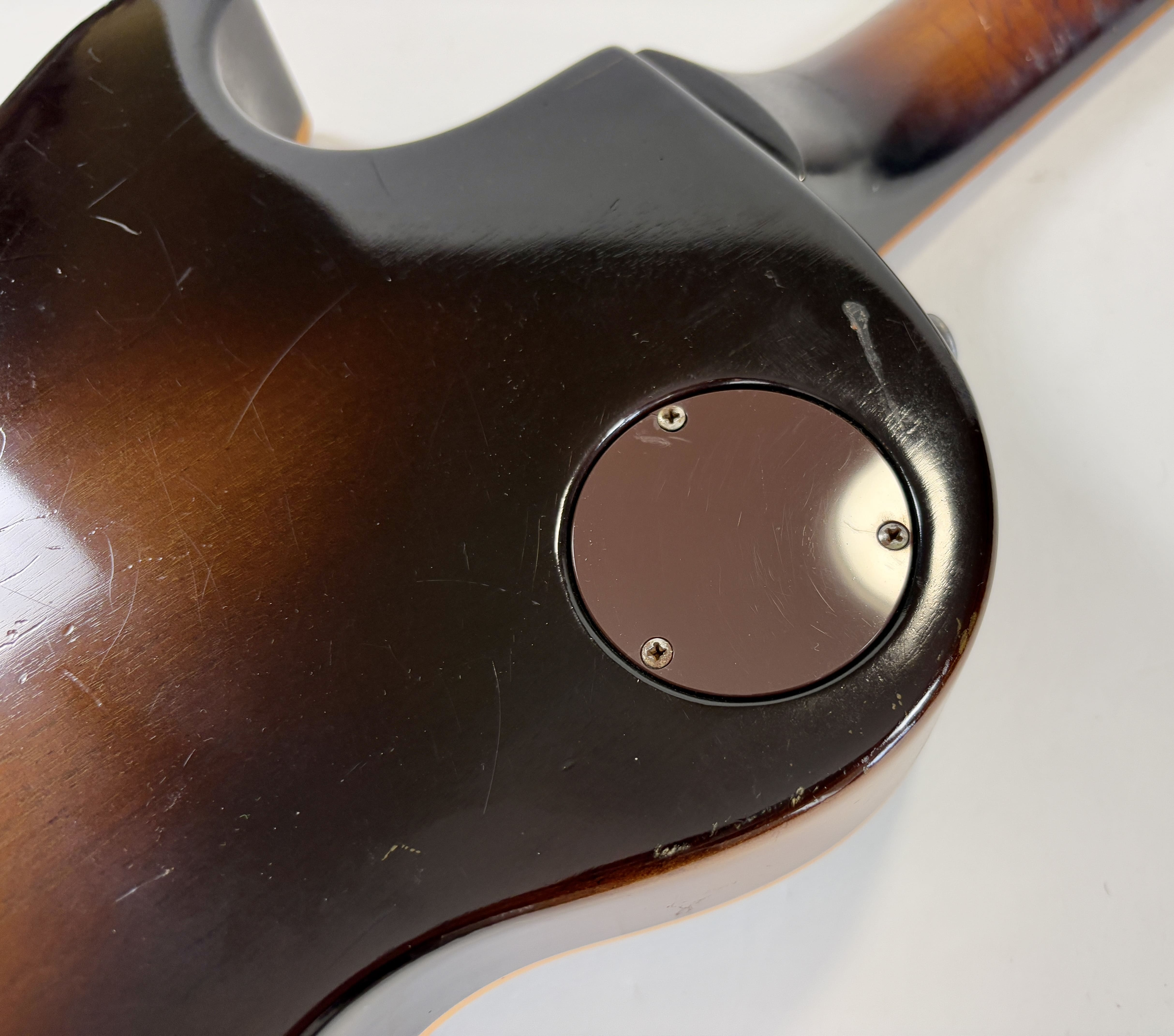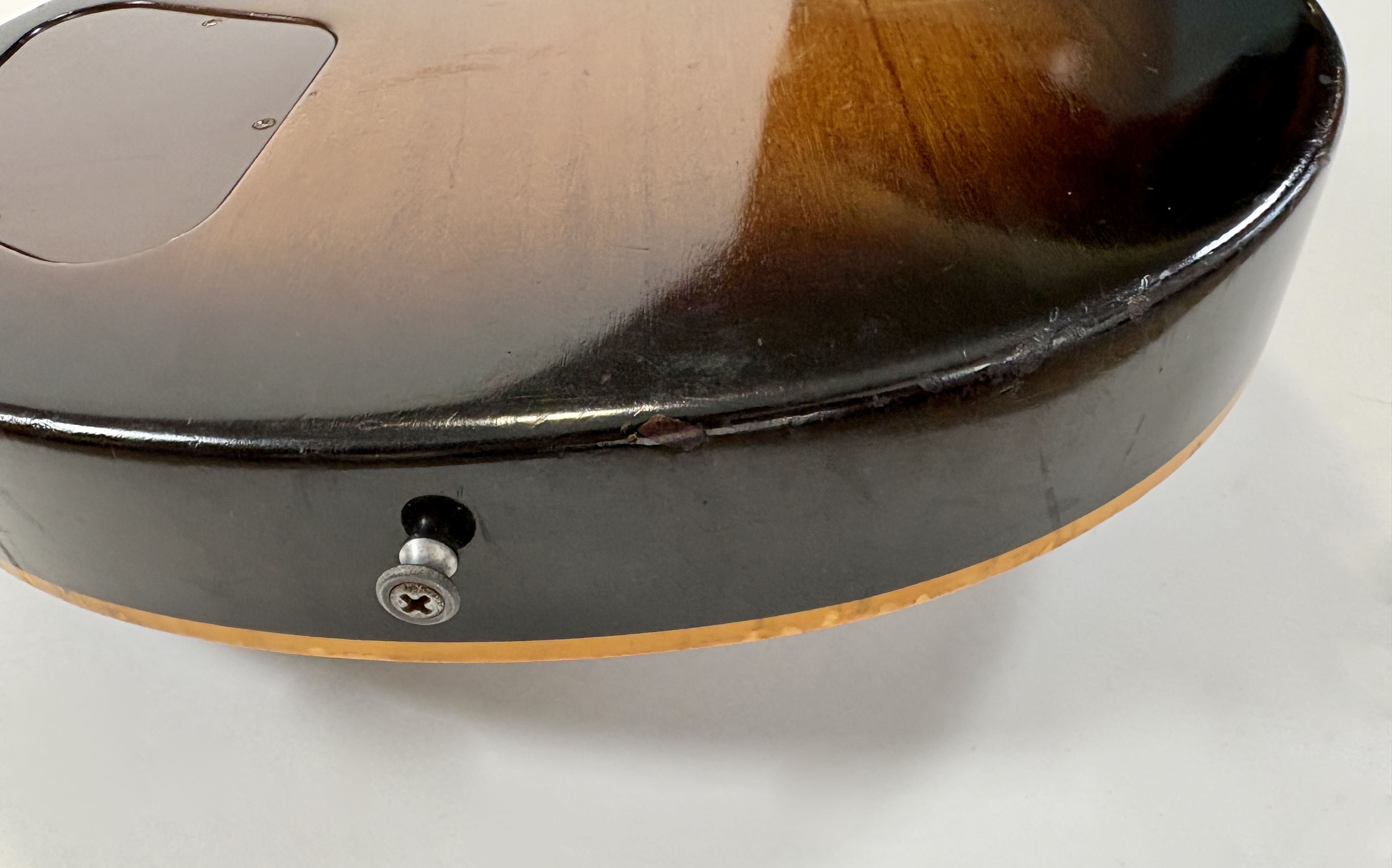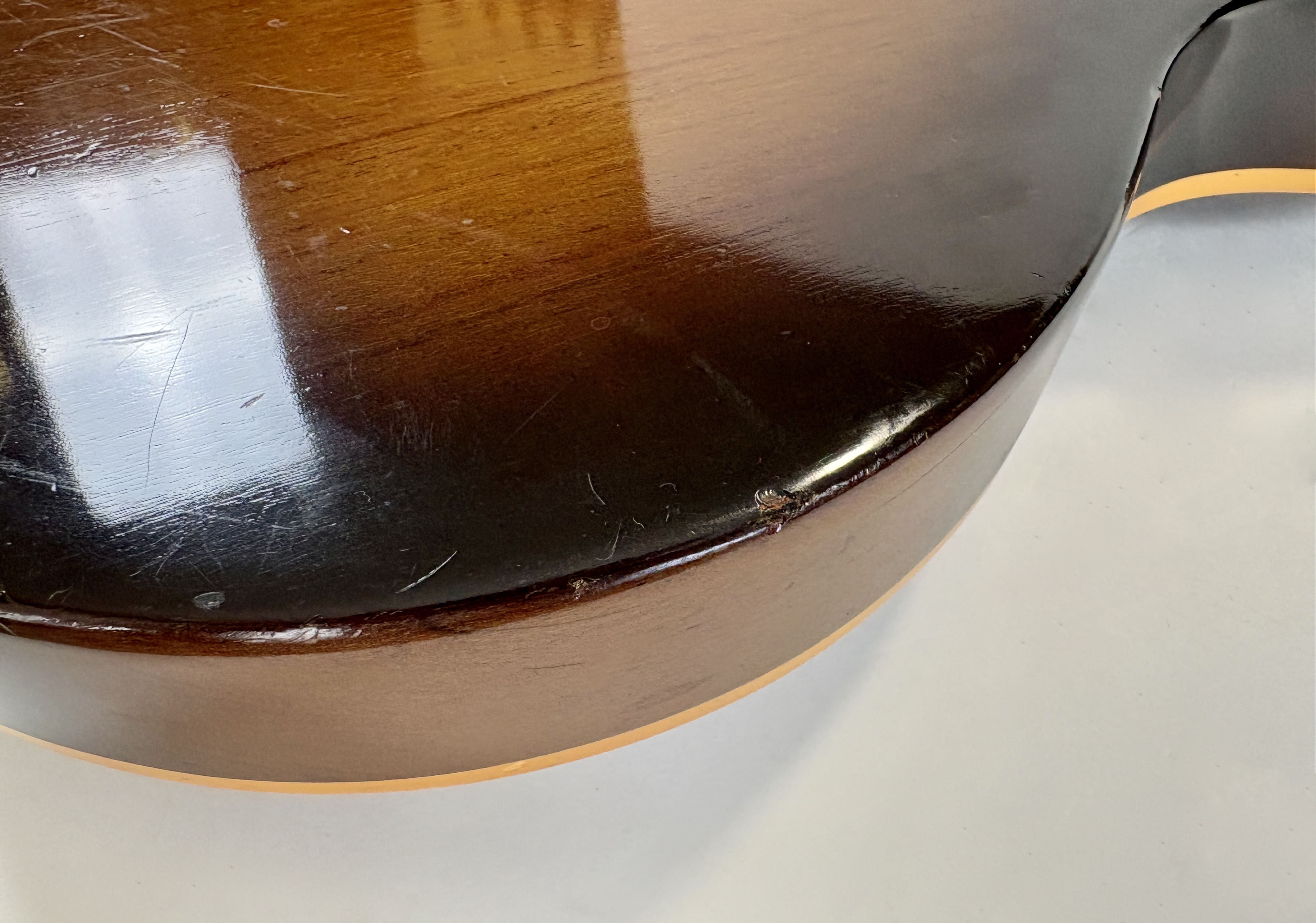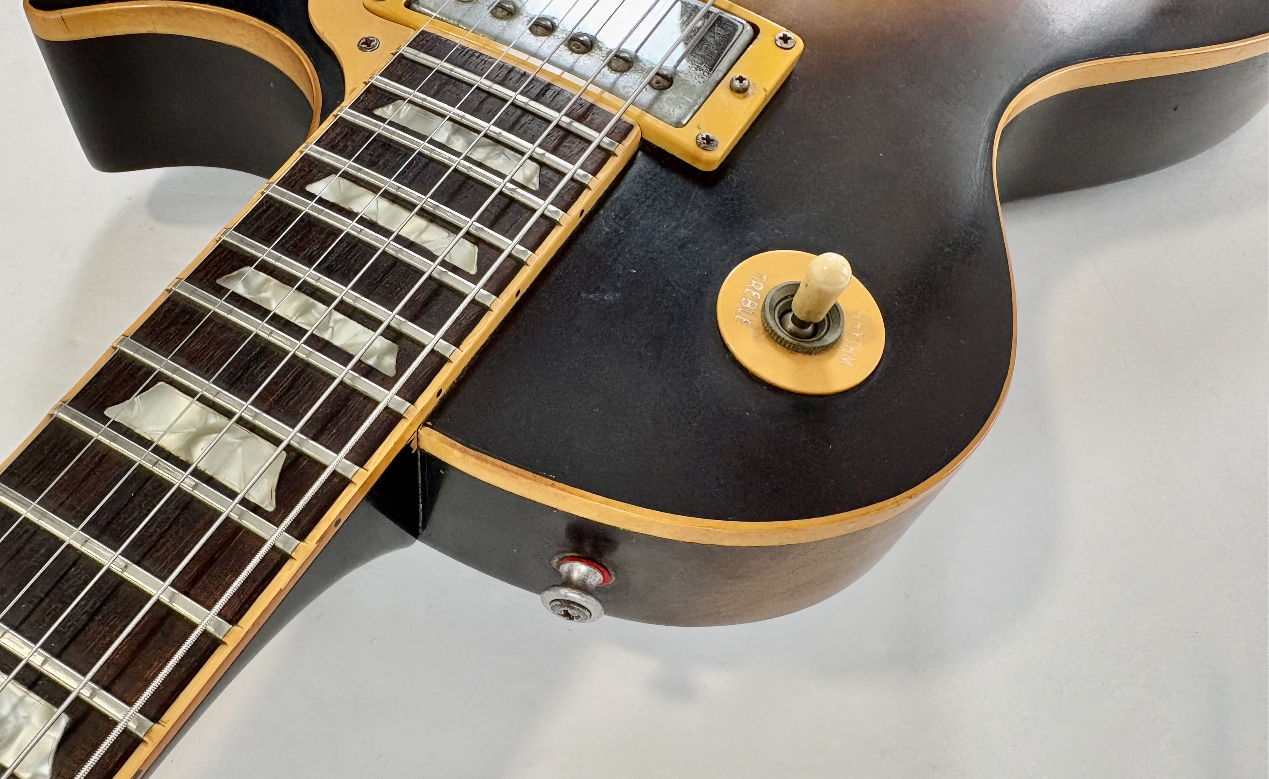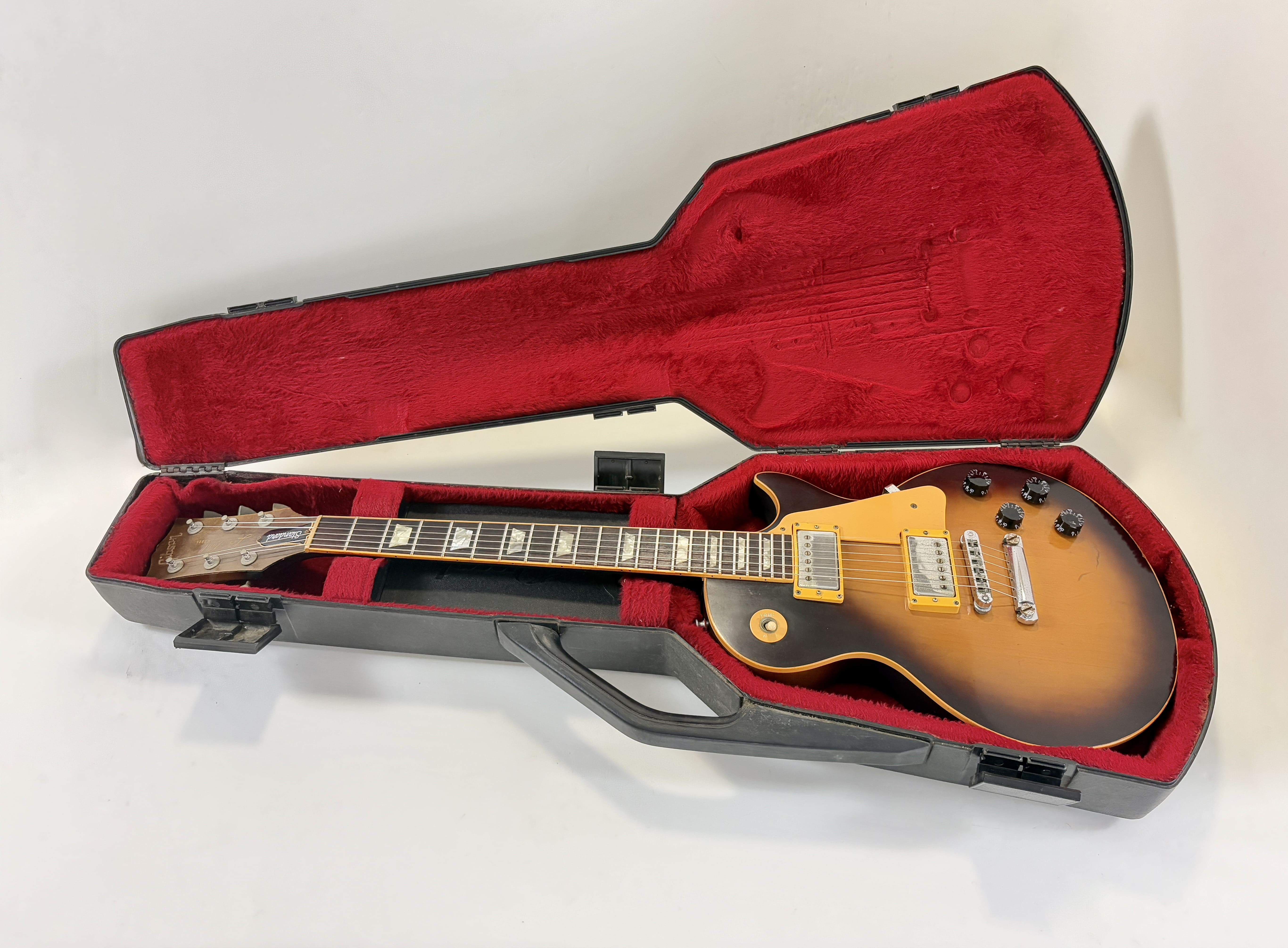 Il a fallu beaucoup de temps à la société Kalamazoo pour réintroduire enfin la "Standard" dans son catalogue : 15 ans ! Après avoir disparu en 1960, la Les Paul est revenue en 1968, mais seulement avec des mini-humbuckers, des P-90 ou des humbuckers sous forme de modèle "Custom". Et voici la plus célèbre d'entre elles : cette Les Paul Standard de 1978. Cet exemplaire présente la construction typique de l'ère Norlin : un corps en acajou, une table en érable en trois parties ainsi qu'un manche en érable en trois parties, et une touche en palissandre. Les micros sont des T-Tops, dignes héritiers des micros PAF et Patent. Elle présente une belle patine et est vendue dans son excellent étui "chainsaw" (style tronçonneuse).