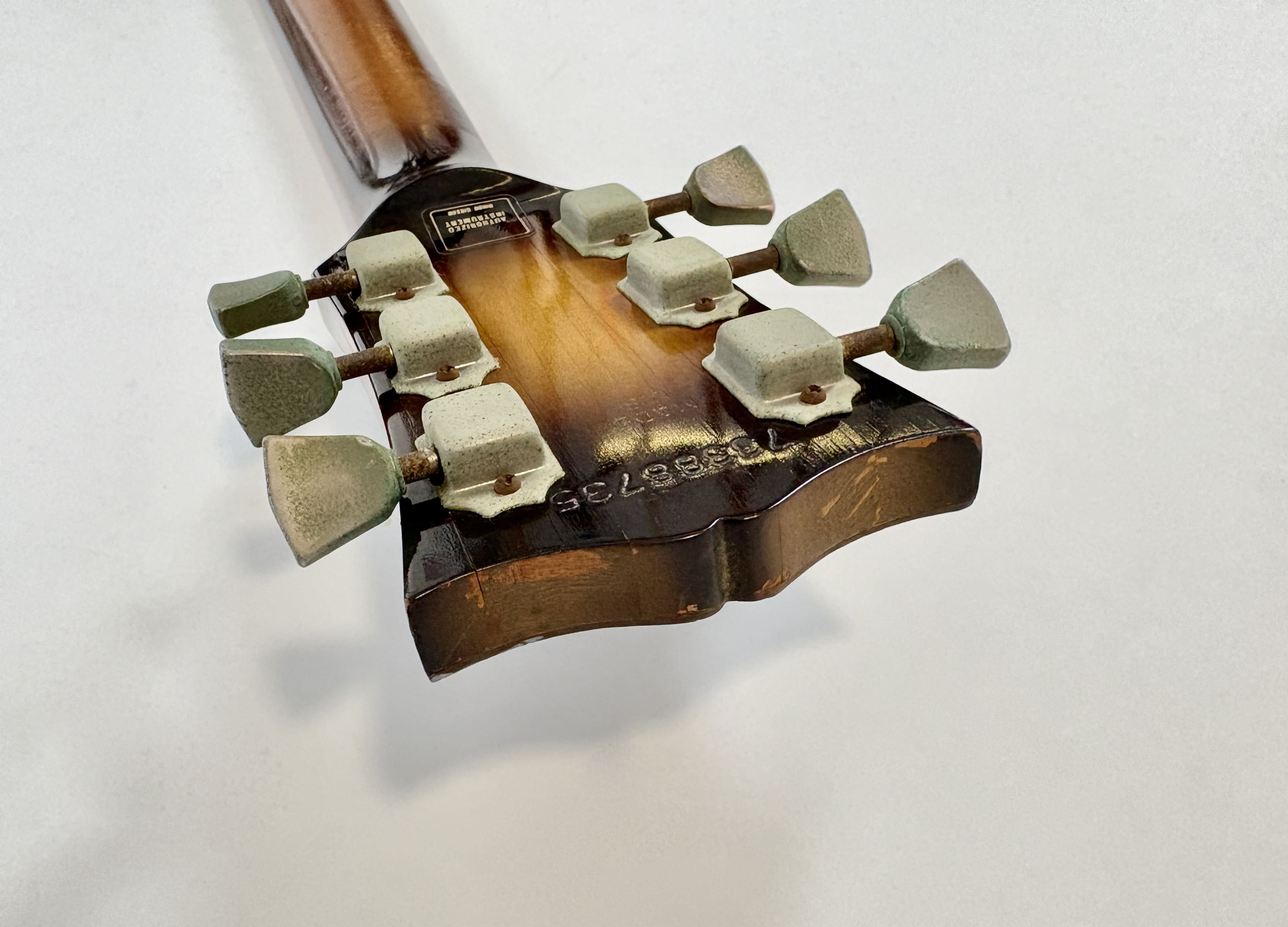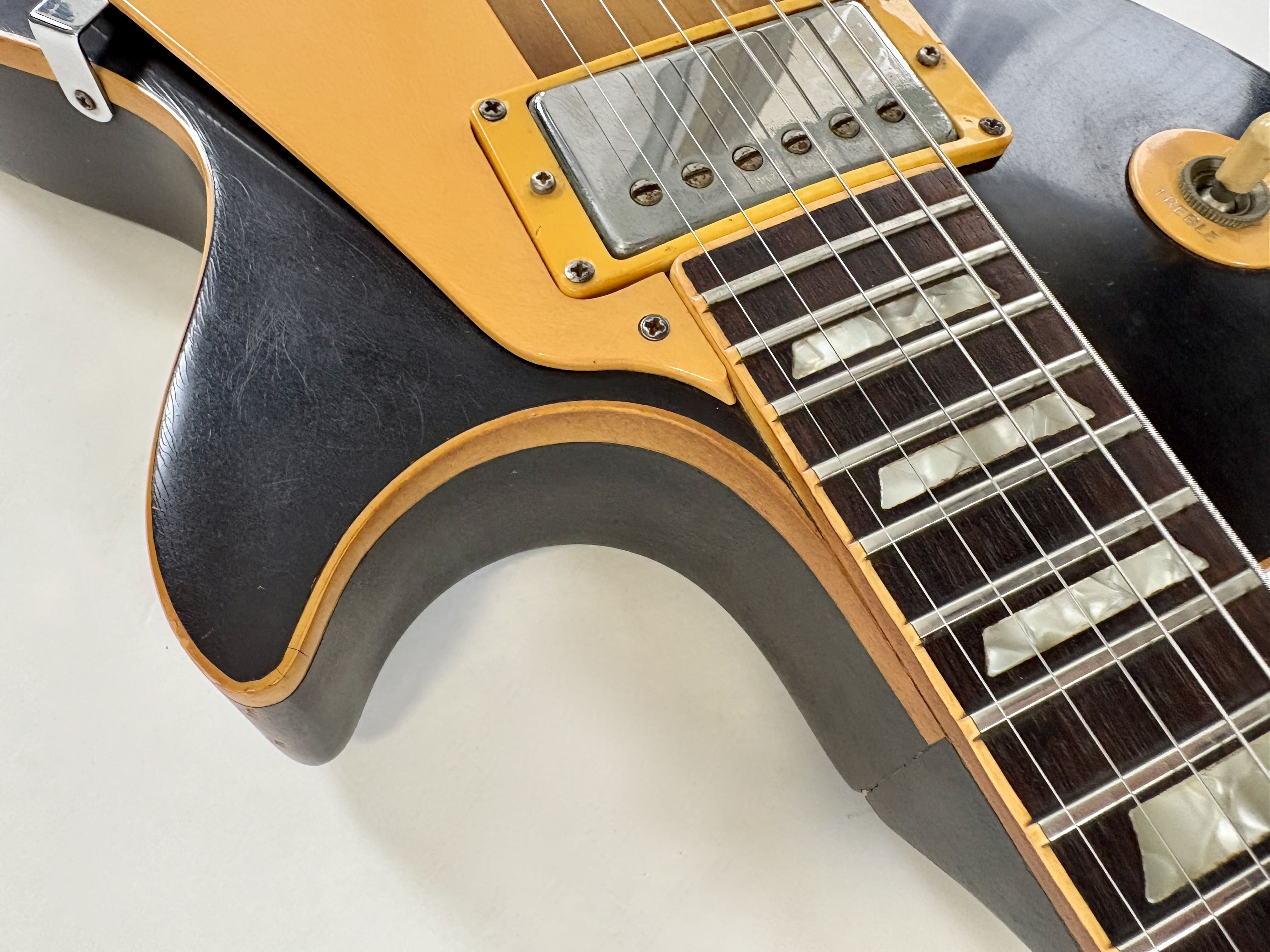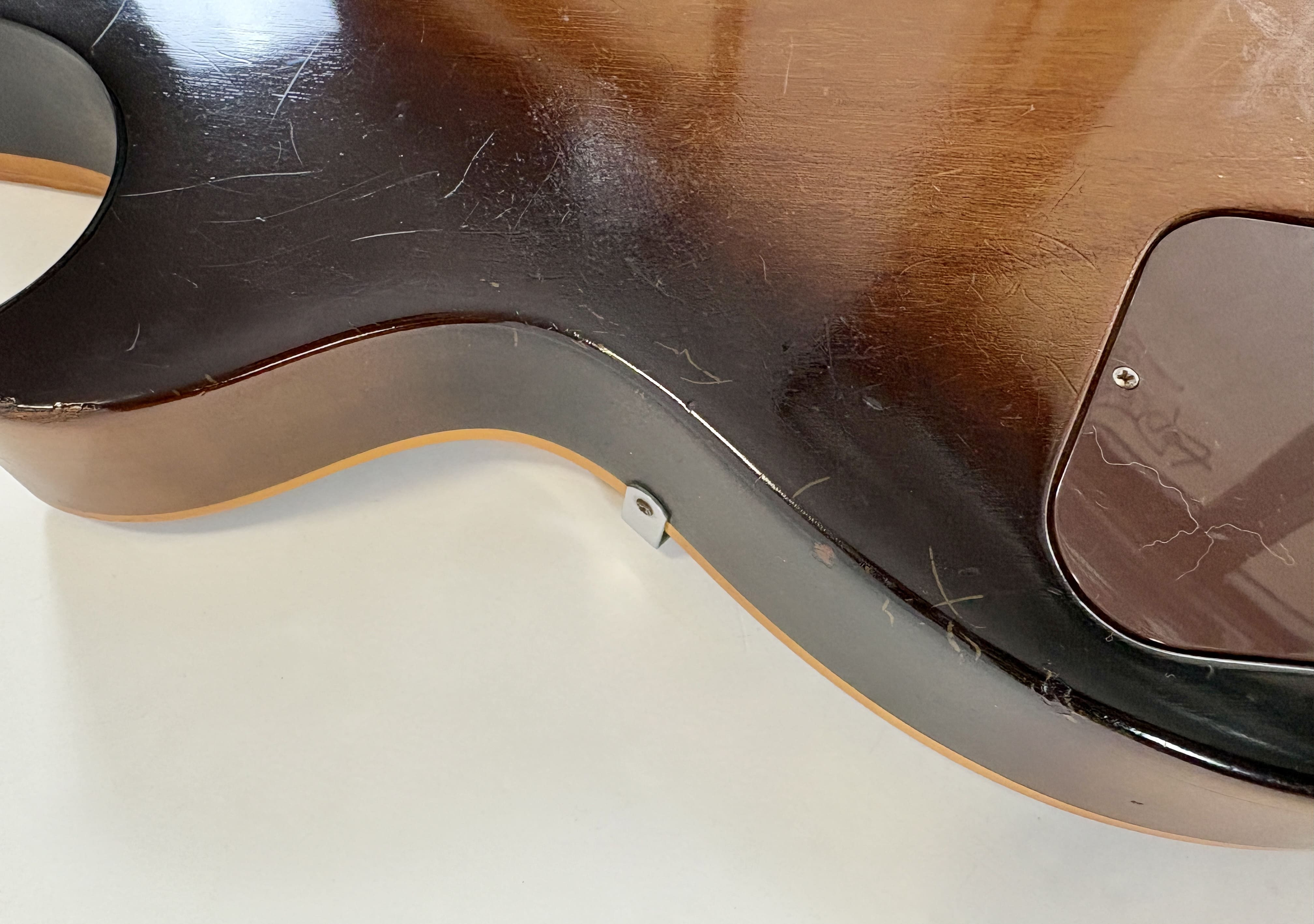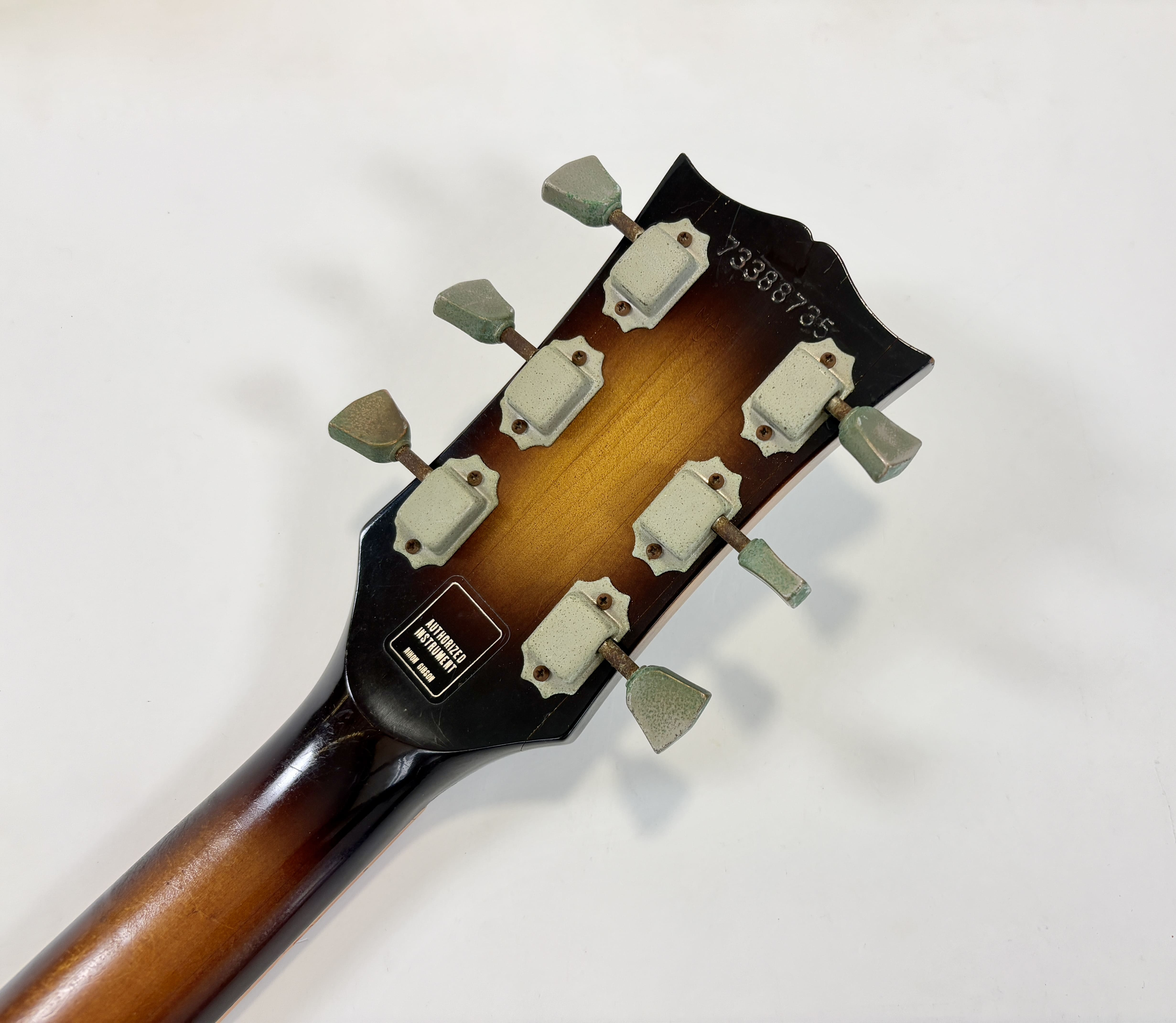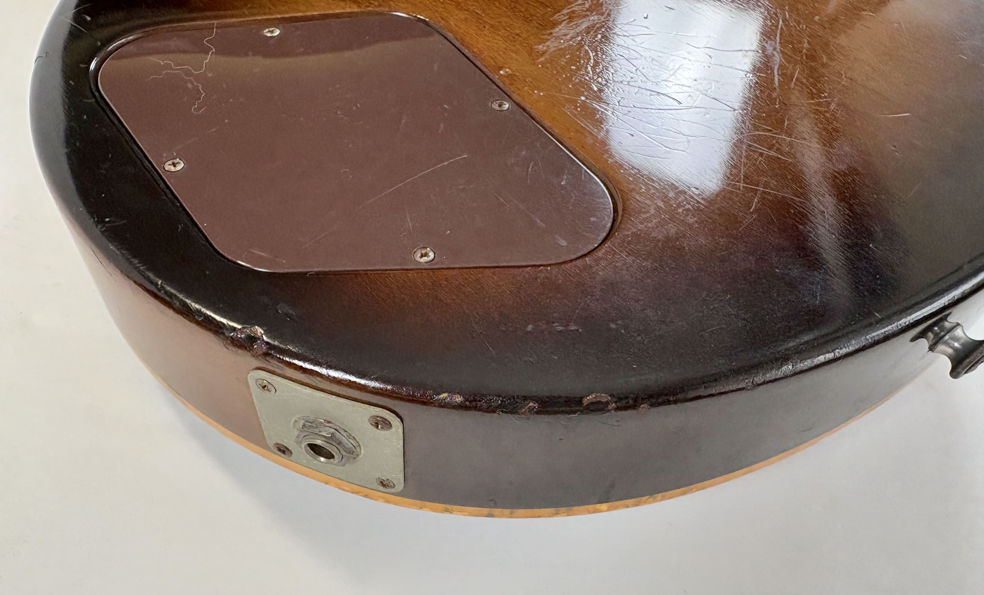 Il a fallu beaucoup de temps à la société Kalamazoo pour réintroduire enfin la "Standard" dans son catalogue : 15 ans ! Après avoir disparu en 1960, la Les Paul est revenue en 1968, mais seulement avec des mini-humbuckers, des P-90 ou des humbuckers sous forme de modèle "Custom". Et voici la plus célèbre d'entre elles : cette Les Paul Standard de 1978. Cet exemplaire présente la construction typique de l'ère Norlin : un corps en acajou, une table en érable en trois parties ainsi qu'un manche en érable en trois parties, et une touche en palissandre. Les micros sont des T-Tops, dignes héritiers des micros PAF et Patent. Elle présente une belle patine et est vendue dans son excellent étui "chainsaw" (style tronçonneuse).