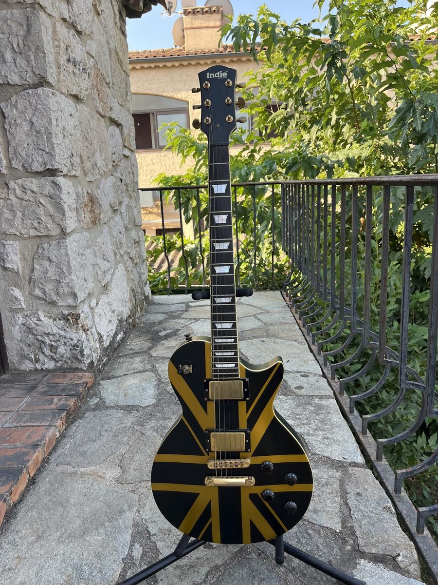 • Corps : Forme Les Paul avec graphique Union Jack en noir et jaune